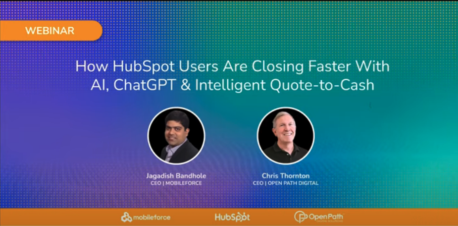 This webinar featured industry experts and CEOs from Mobileforce and Open Path Digital discussing “How HubSpot Users Are Closing Faster With AI, ChatGPT & Intelligent Quote-to-Cash.” This webinar will help you learn how