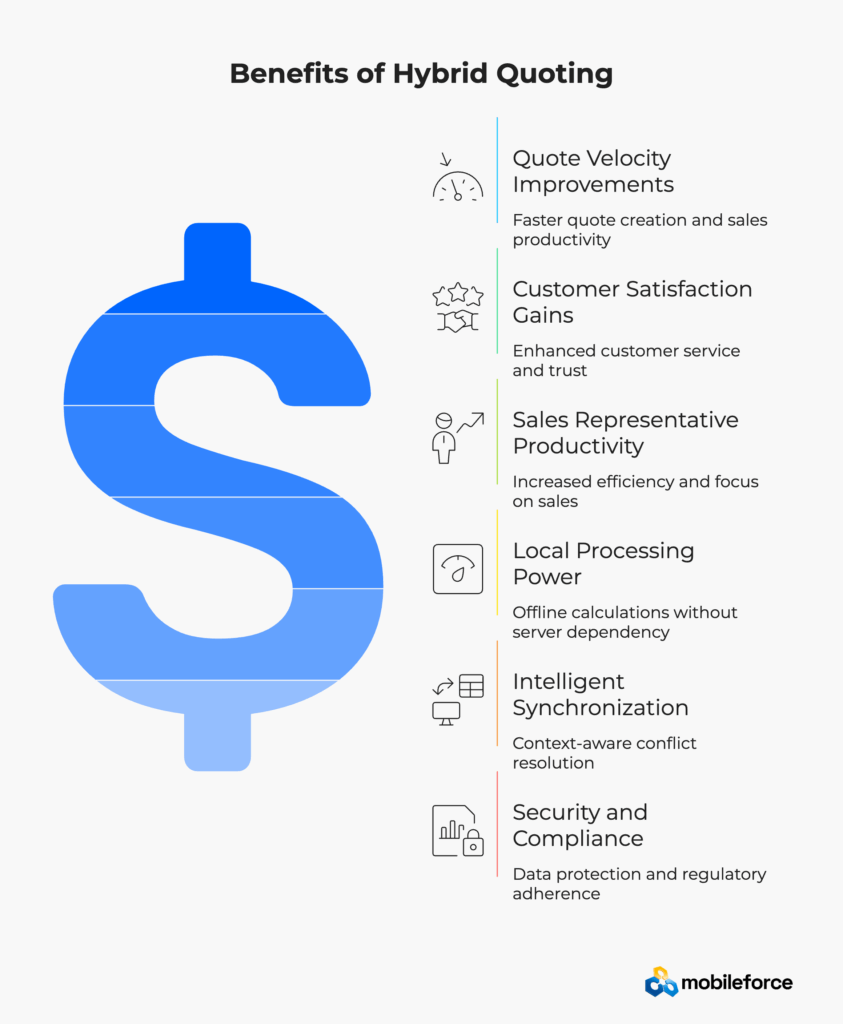 Quote velocity improvements provide immediate evidence of hybrid quoting value for sales productivity enhancement. Organizations implementing purpose-built solutions like Mobileforce typically achieve significant time savings in quote creation compared to manual processes during connectivity failures, directly impacting sales force automation effectiveness.