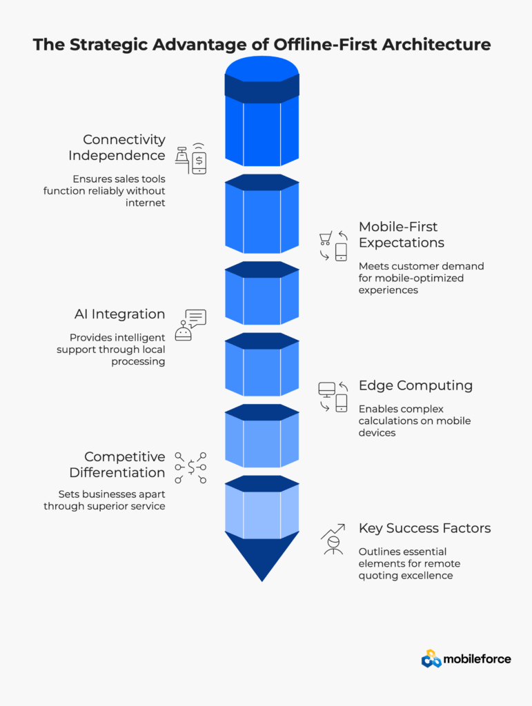 According to McKinsey research on digital transformation, organizations implementing comprehensive mobile-first architectures see significant improvements in customer satisfaction and response times. These performance metrics become critical when sales teams operate in challenging connectivity environments where traditional quote software fails completely.