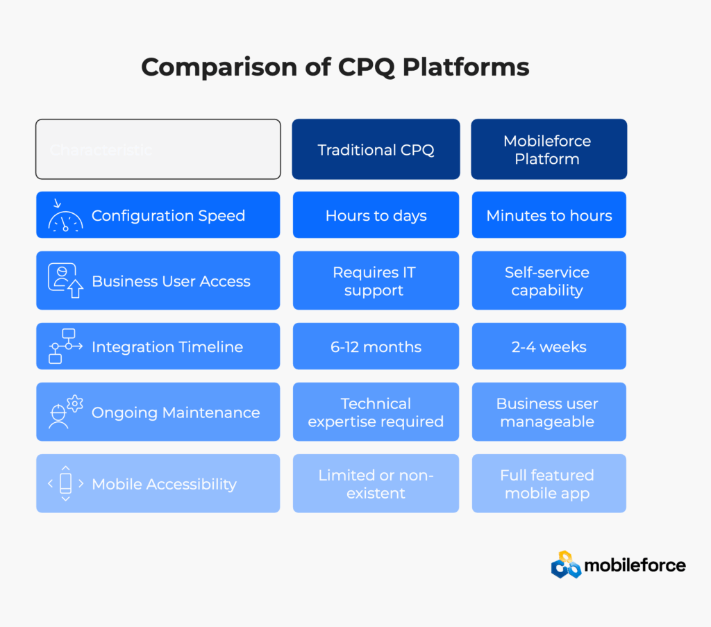 Mobileforce’s no-code platform exemplifies this evolution, enabling business users to configure complex product rules without technical expertise while maintaining enterprise-grade performance and security.