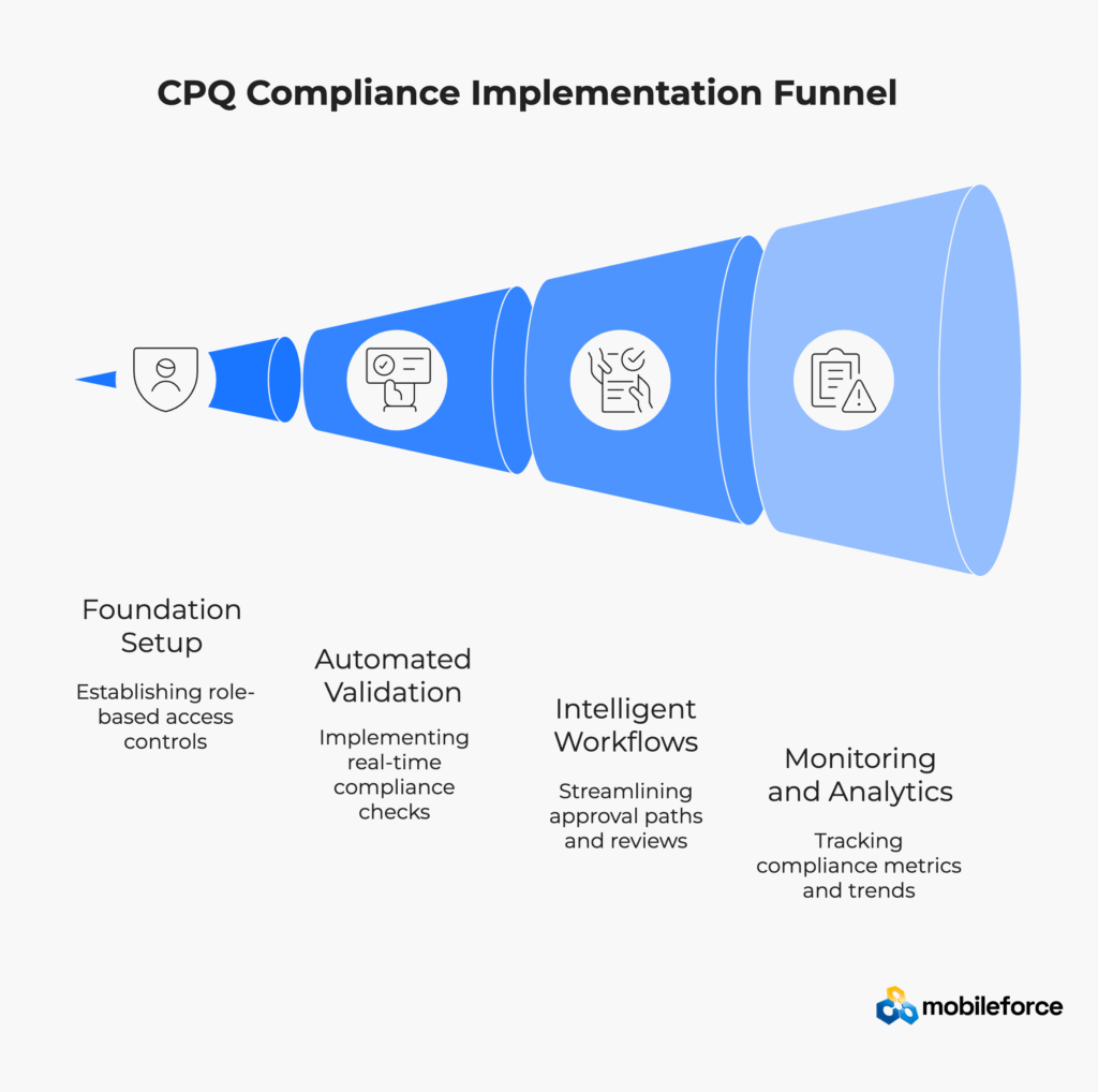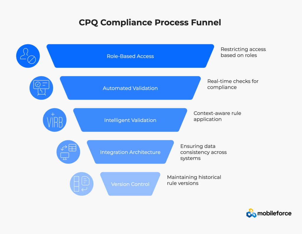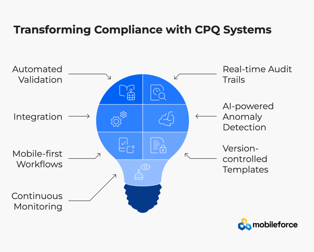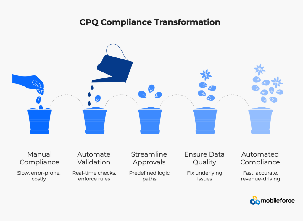 That principle, borrowed from manufacturing quality control, perfectly captures the modern approach to CPQ compliance. Instead of checking quotes after creation, build validation directly into the configuration process. Rather than reviewing discounts post-approval, enforce limits automatically. Don’t audit for missing documentation—require it upfront.