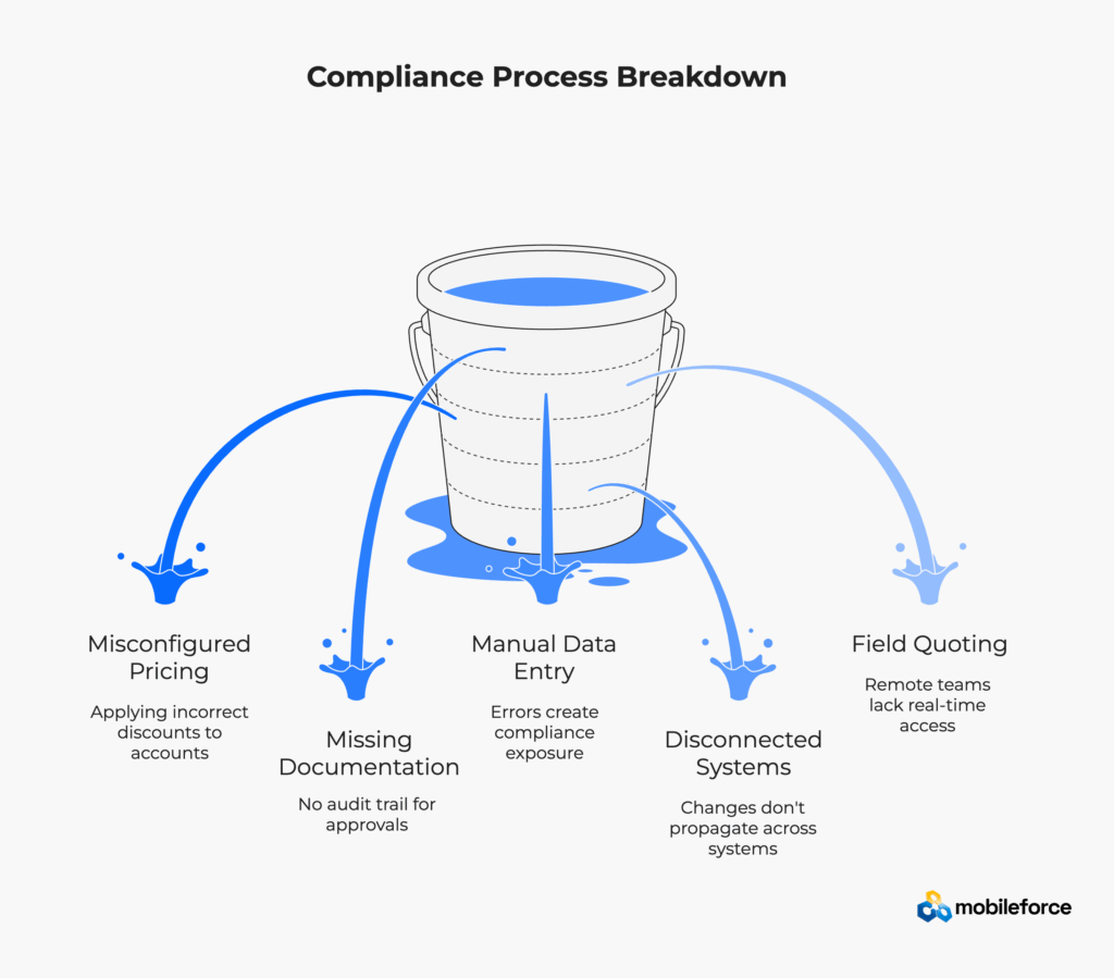 Field quoting introduces unique compliance challenges. Remote sales teams, disconnected from corporate systems, often resort to spreadsheets and manual calculations. They lack real-time access to current pricing, product availability, and promotional terms. By the time their quotes enter the system, compliance violations are already baked in.