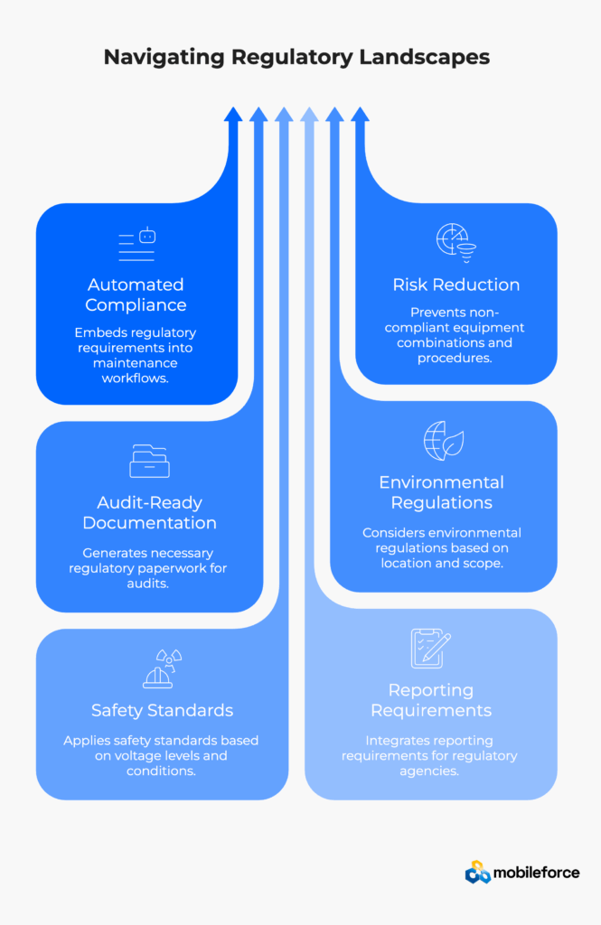 Automated compliance documentation eliminates manual paperwork that slows emergency power outage responses. Templates ensure consistency across different maintenance scenarios while capturing audit trails required by regulatory bodies for electrical infrastructure compliance. Rule-based validation prevents unsafe equipment configurations or invalid parts combinations that could compromise power system reliability.