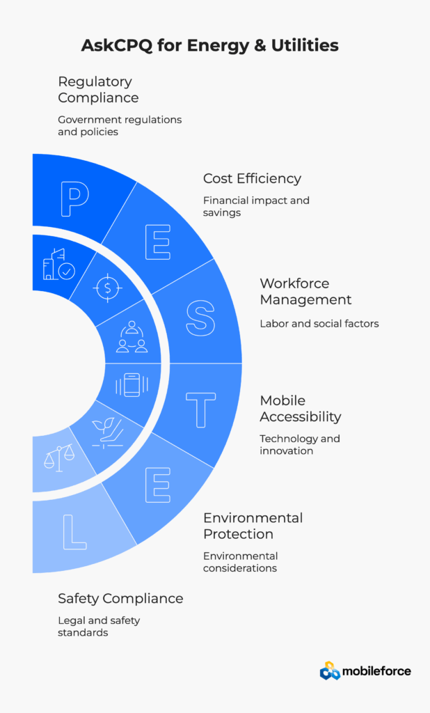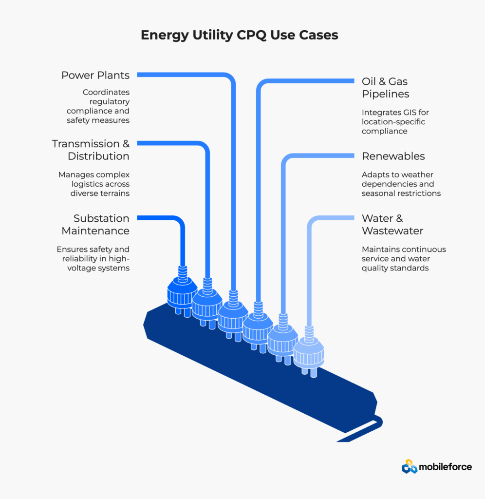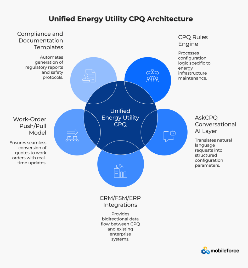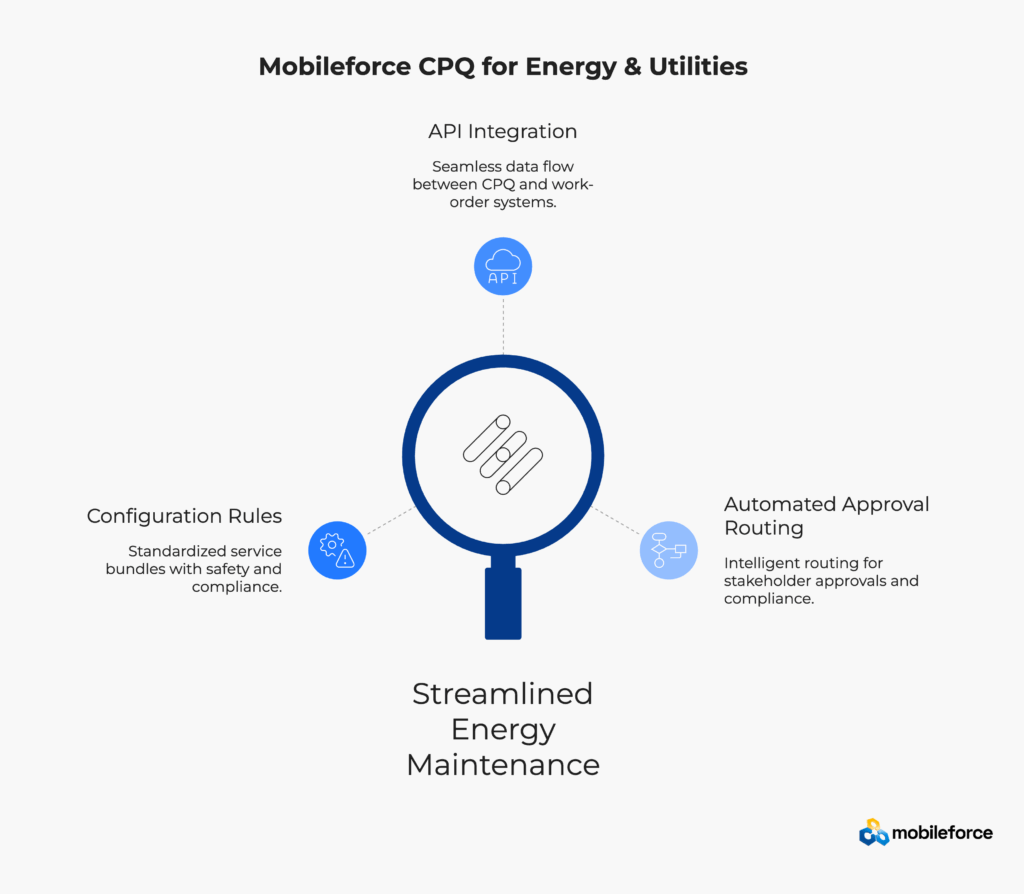 Mobileforce’s CPQ platform addresses energy and utilities challenges through specialized configuration capabilities designed for complex infrastructure maintenance. The platform recognizes that power generation, transmission, and distribution equipment requires sophisticated service bundling that accounts for safety protocols, environmental factors, and regulatory compliance.