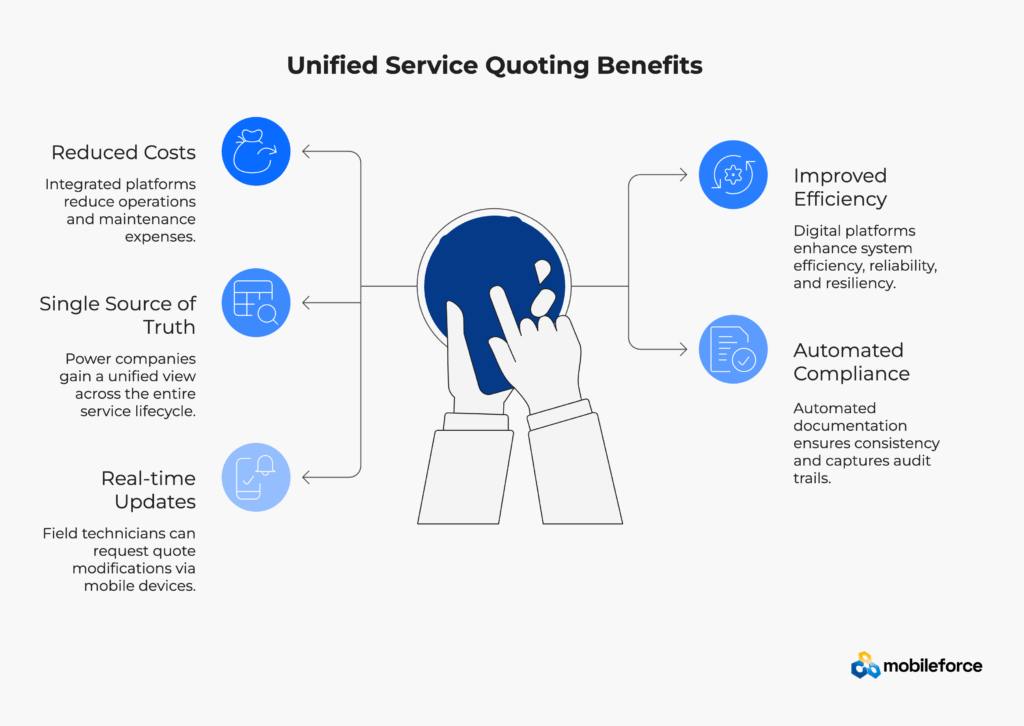 Definition: Unified service quoting for energy utilities combines configure-price-quote functionality with integrated work-order management to create seamless workflows from maintenance planning through project completion. This energy sector quote management approach eliminates disconnected systems that plague traditional utility operations management.