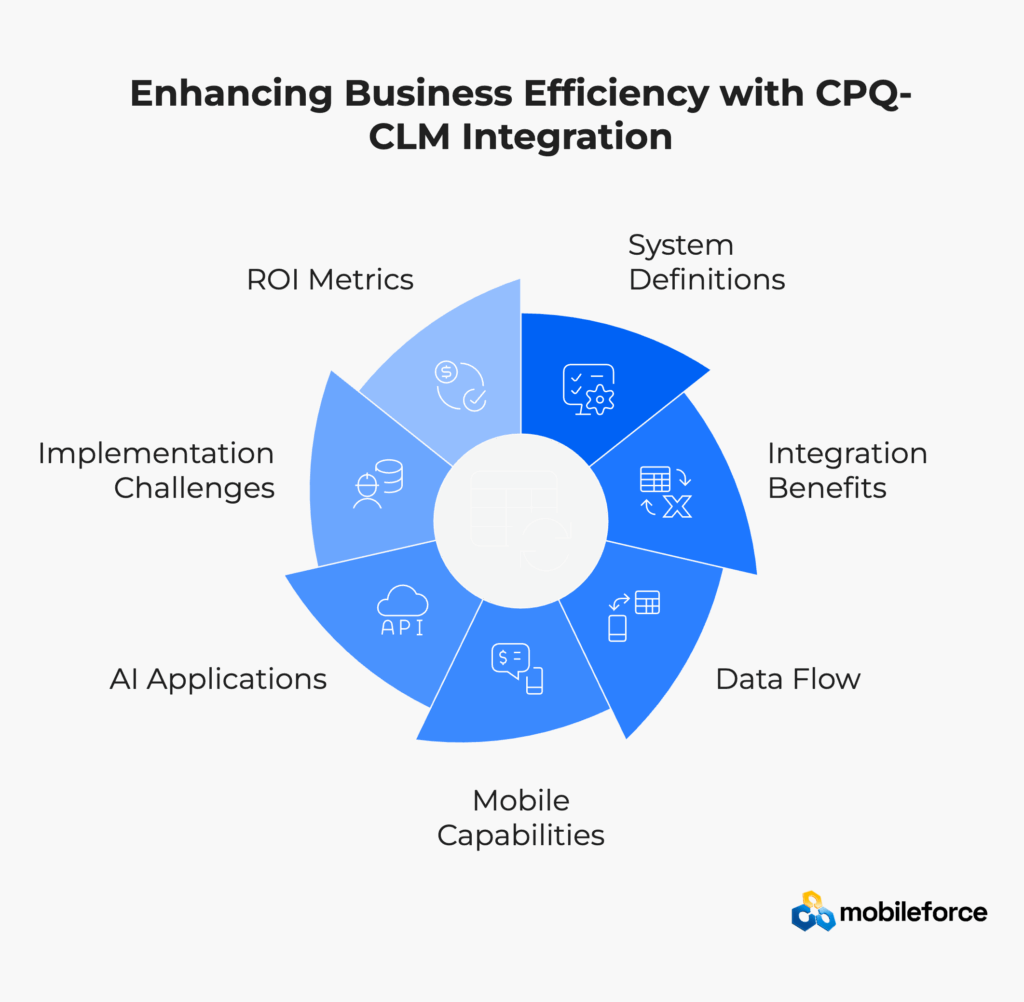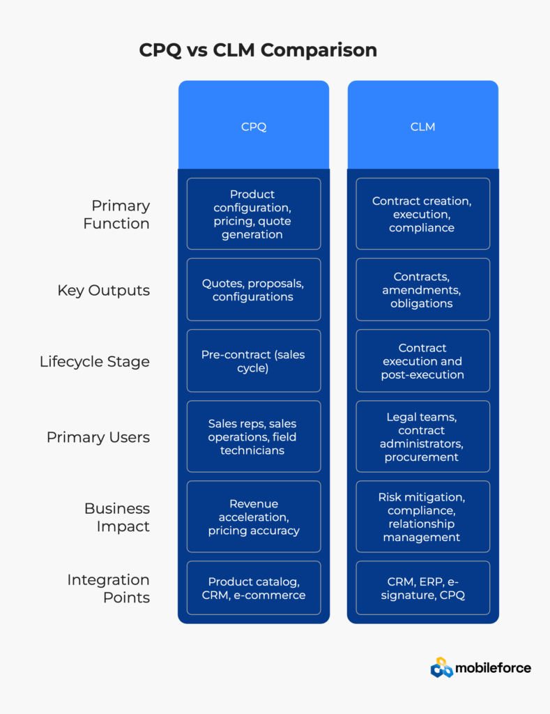 CPQ (Configure-Price-Quote) and CLM (Contract Lifecycle Management) systems serve different yet complementary functions in the sales process. CPQ handles product configuration, pricing rules, and quote generation, while CLM manages contract creation, execution, and ongoing compliance. When integrated properly, they create a seamless quote-to-contract workflow that reduces errors by 42%, accelerates deal closure by 27%, and ensures consistency across all customer-facing documents. This guide explores their relationship, integration techniques, and how Mobileforce’s solutions enhance this critical business process.