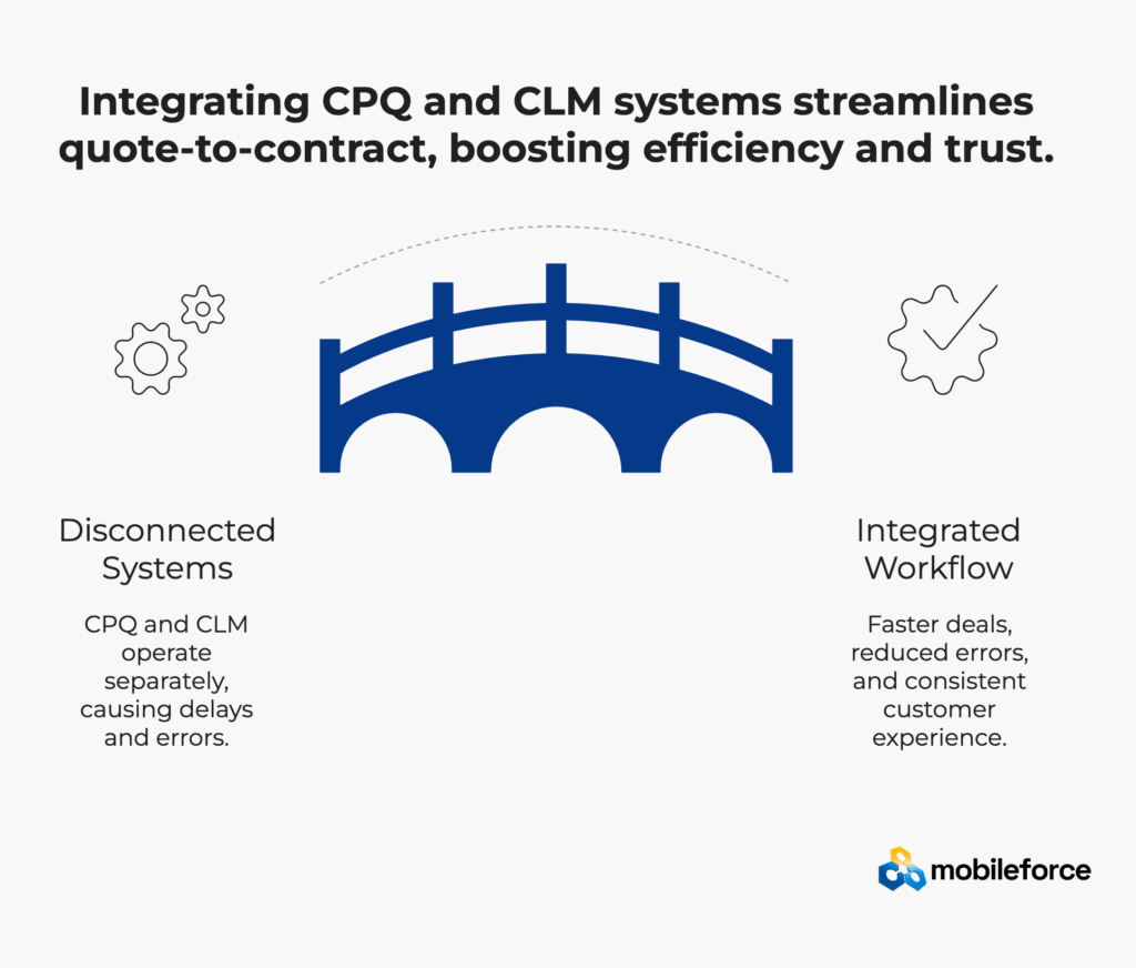 The question isn’t whether to integrate CPQ and CLM systems, but how quickly you can do it effectively. In today’s competitive environment, companies that can generate accurate quotes and execute contracts faster will win more deals, satisfy more customers, and grow more profitably.
