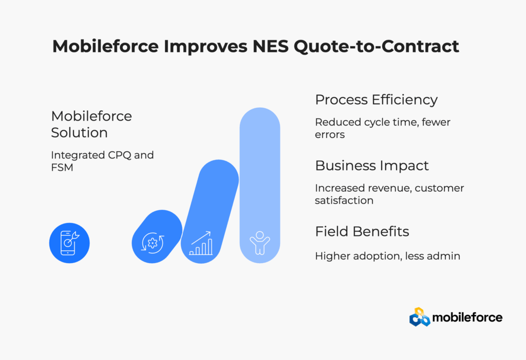 NES implemented Mobileforce’s integrated CPQ and Field Service Management solution with seamless handoff to their existing CLM system. Key components included: