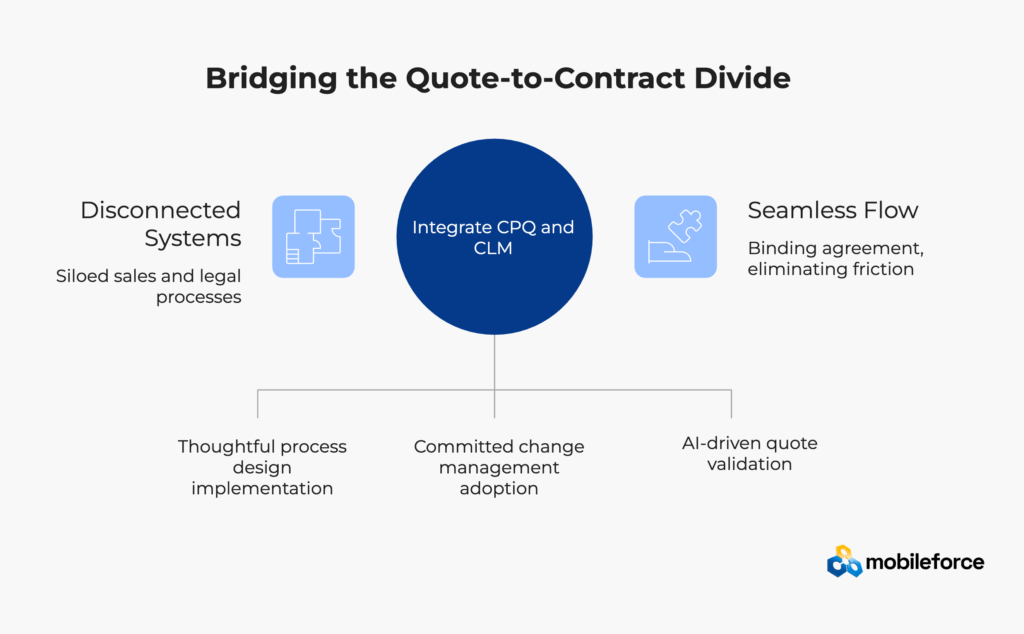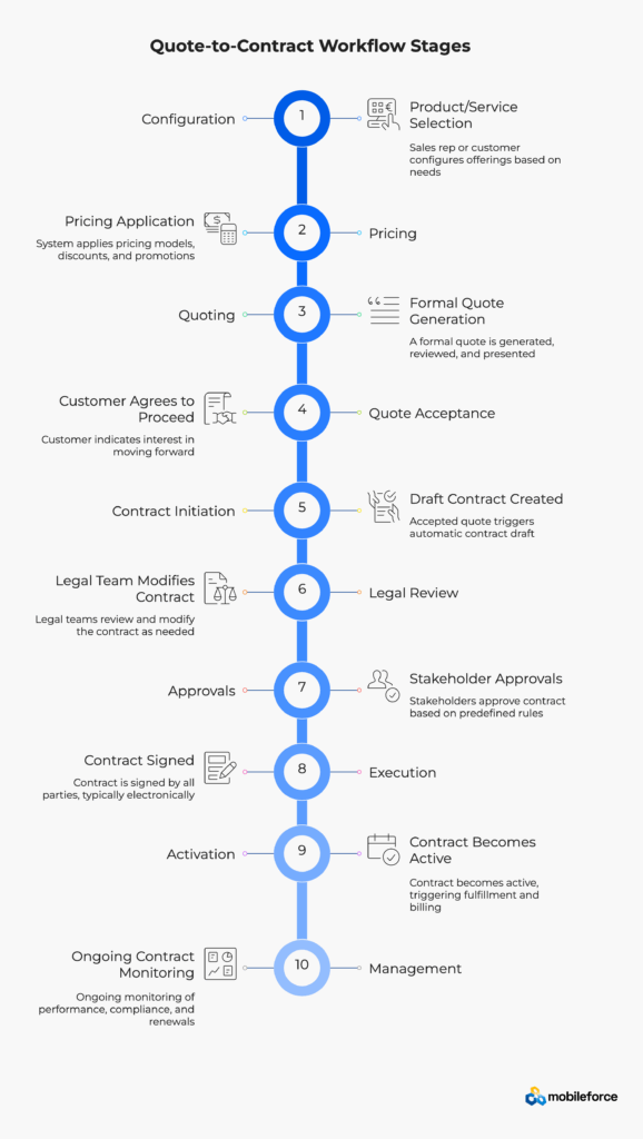 According to Mobileforce’s approach to configure-price-quote solutions, “The handoff from quote to contract represents a critical moment where sales intent must translate perfectly into legal obligation—any disconnect creates risk for both parties.”