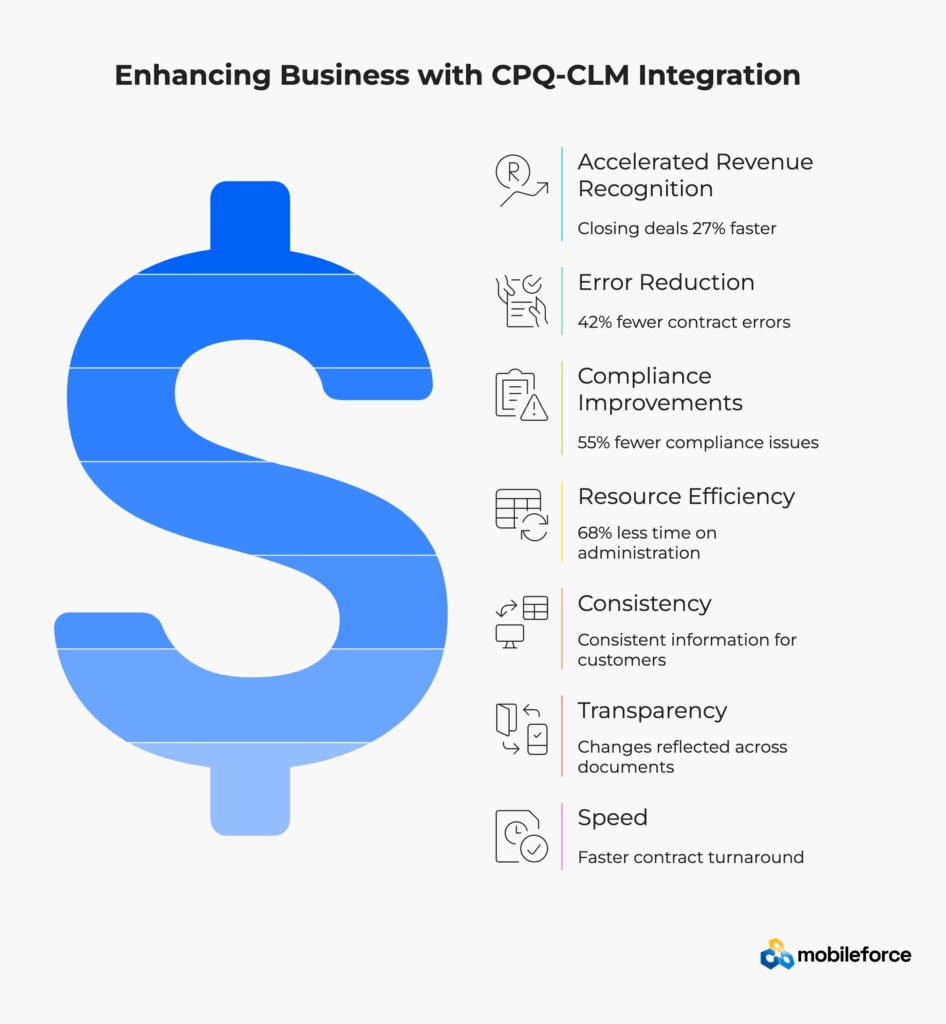 Accelerated Revenue Recognition: According to Aberdeen Group research, companies with integrated CPQ and CLM systems close deals 27% faster than those with disconnected systems. This acceleration directly impacts revenue recognition timing and cash flow.
