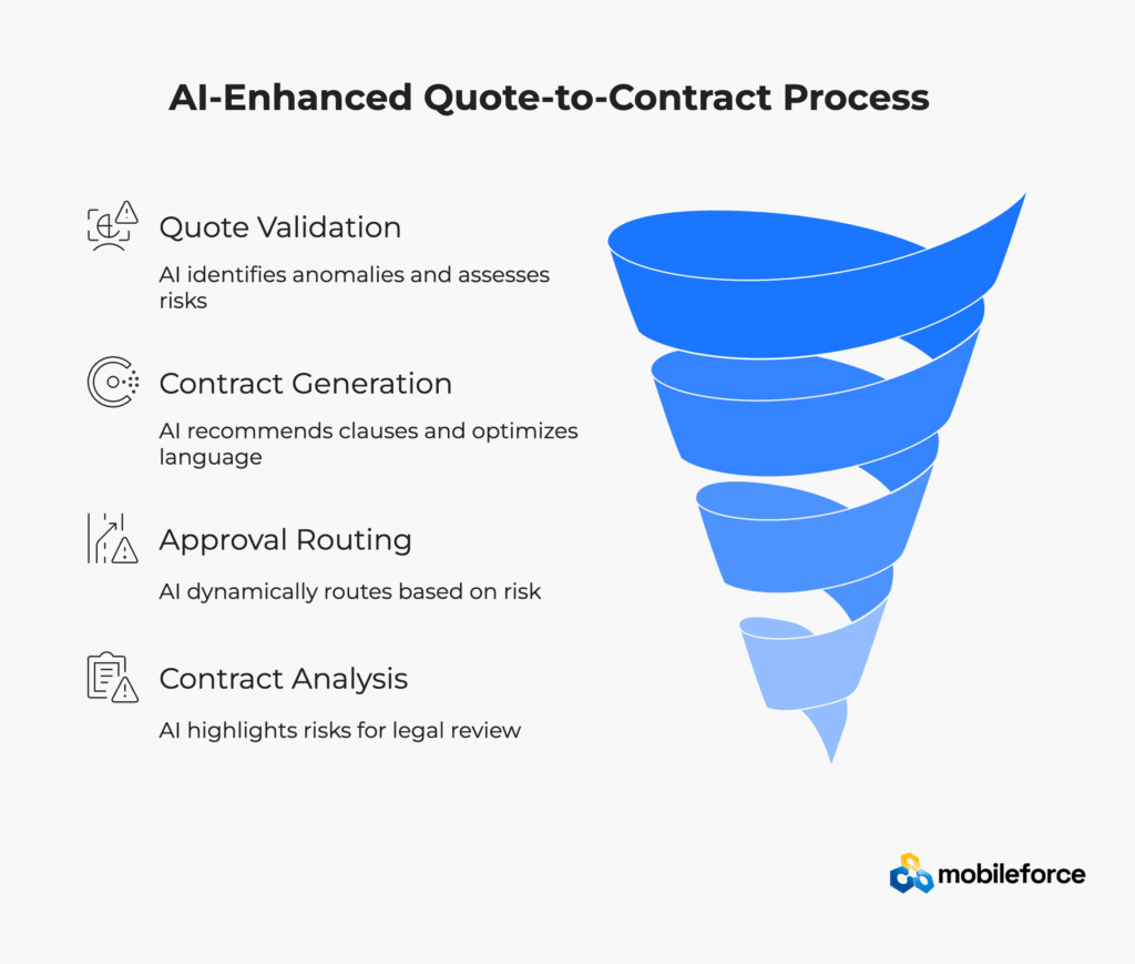 AI enhances quote-to-contract processes through anomaly detection (identifying unusual configurations or terms), clause recommendation (suggesting appropriate contract language based on quote attributes), risk assessment (flagging potentially problematic terms), and predictive analytics (forecasting approval timelines and win probabilities). As AI capabilities advance, these systems are becoming increasingly proactive in optimizing both quotes and contracts.