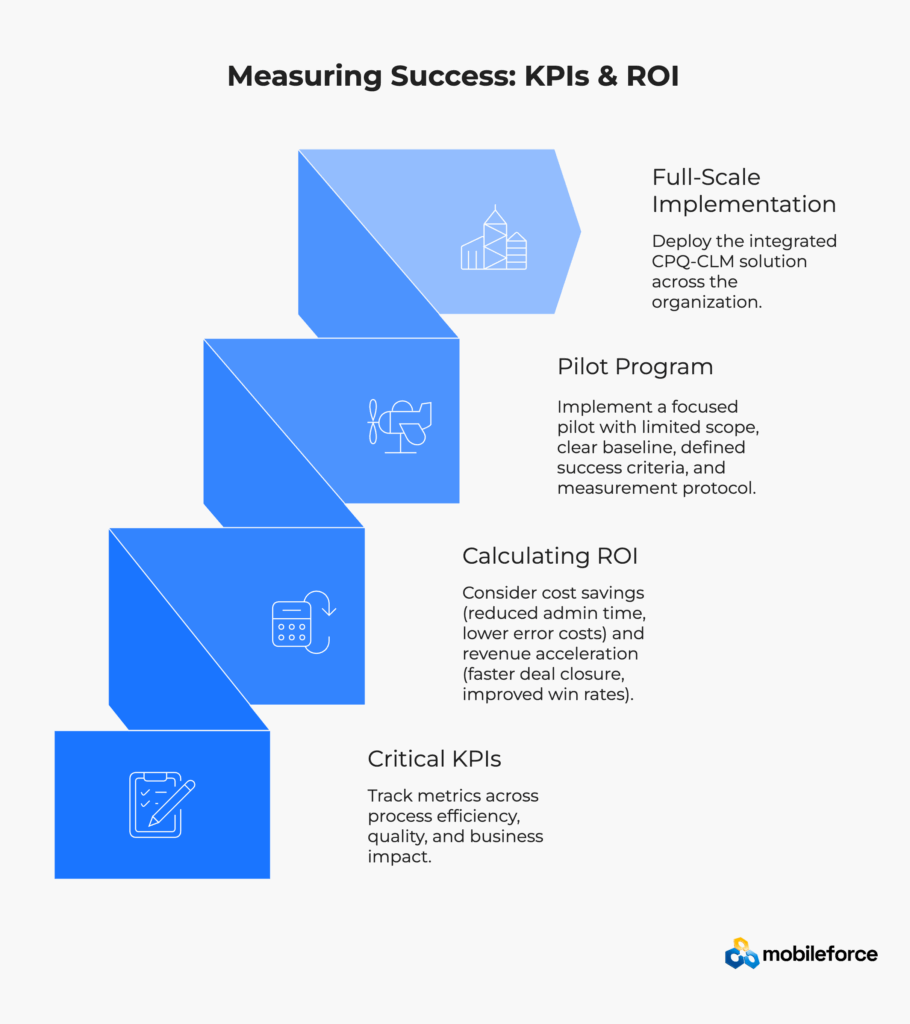 Implementing an integrated CPQ-CLM solution represents a significant investment. Measuring its success requires a comprehensive set of key performance indicators (KPIs) and a clear approach to calculating return on investment (ROI).