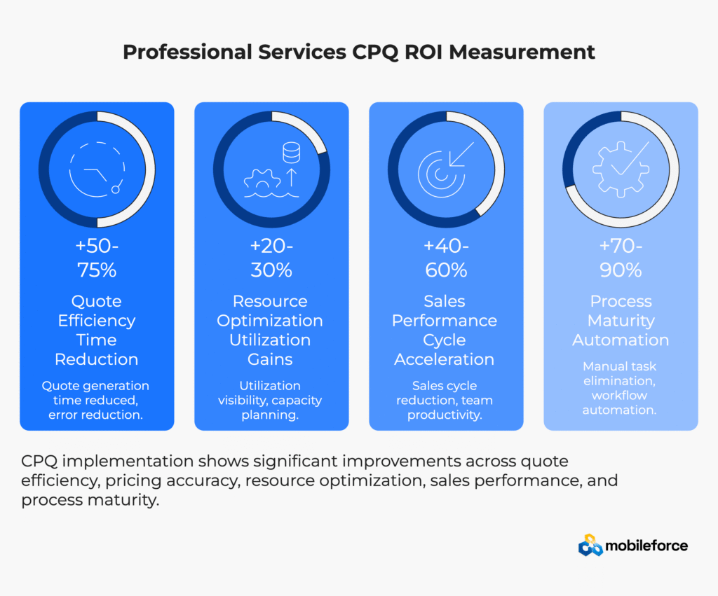 Consulting firms typically see 40-75% faster quote generation, significant improvements in pricing accuracy, and 20-30% increases in sales team productivity within 6-12 months of implementation. Companies report quote turnaround time reductions exceeding 50% after specialized CPQ implementation.