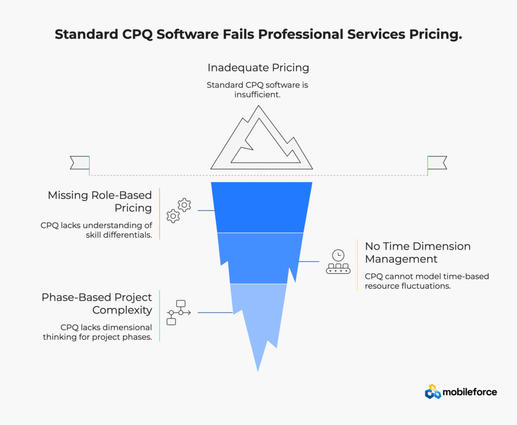 Can standard CPQ software handle professional services pricing? Traditional product-based CPQ systems are designed for physical goods with fixed pricing, not the dynamic, relationship-based pricing models that professional services firms require for consulting engagements, time and materials projects, and complex service delivery scenarios.