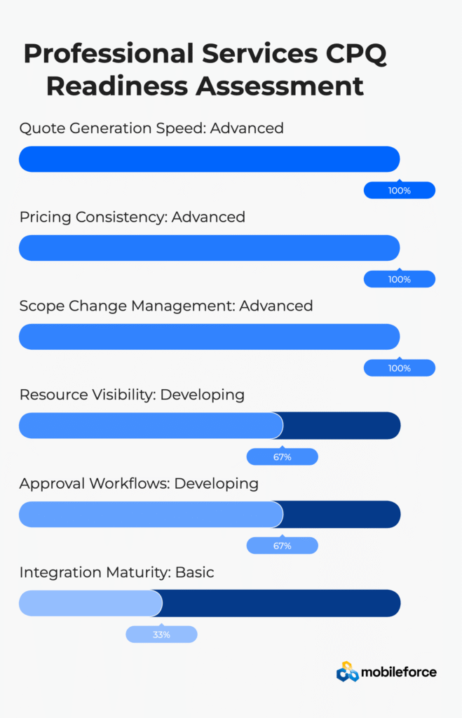 Assessment Scoring: Count your “Basic” responses to identify pain points requiring immediate attention. “High Priority” gaps should drive your CPQ platform selection criteria. Most professional services firms score “Basic” in 3-4 areas, indicating significant automation opportunities.