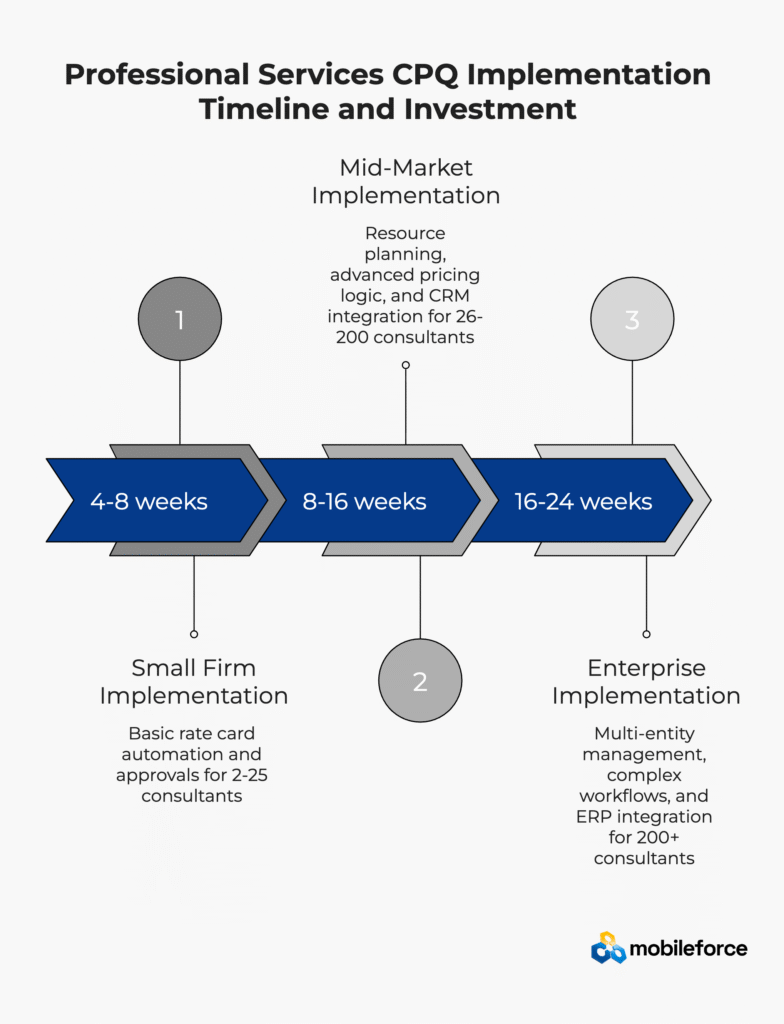 How long does professional services CPQ implementation take? Most consulting firms achieve basic quote automation within 8-12 weeks, with full platform optimization requiring 16-24 weeks depending on organizational complexity and integration requirements. Successful implementations follow structured phases that prioritize quick wins while building comprehensive capabilities.