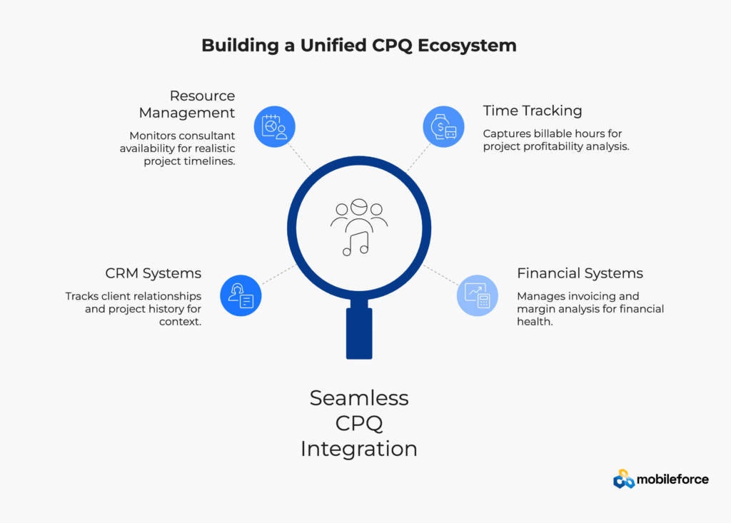 Implementation Wisdom: Many firms make the mistake of attempting comprehensive integration simultaneously. This approach creates project complexity that delays basic CPQ functionality. Focus on getting core quoting automation working first, then add integration layers progressively.