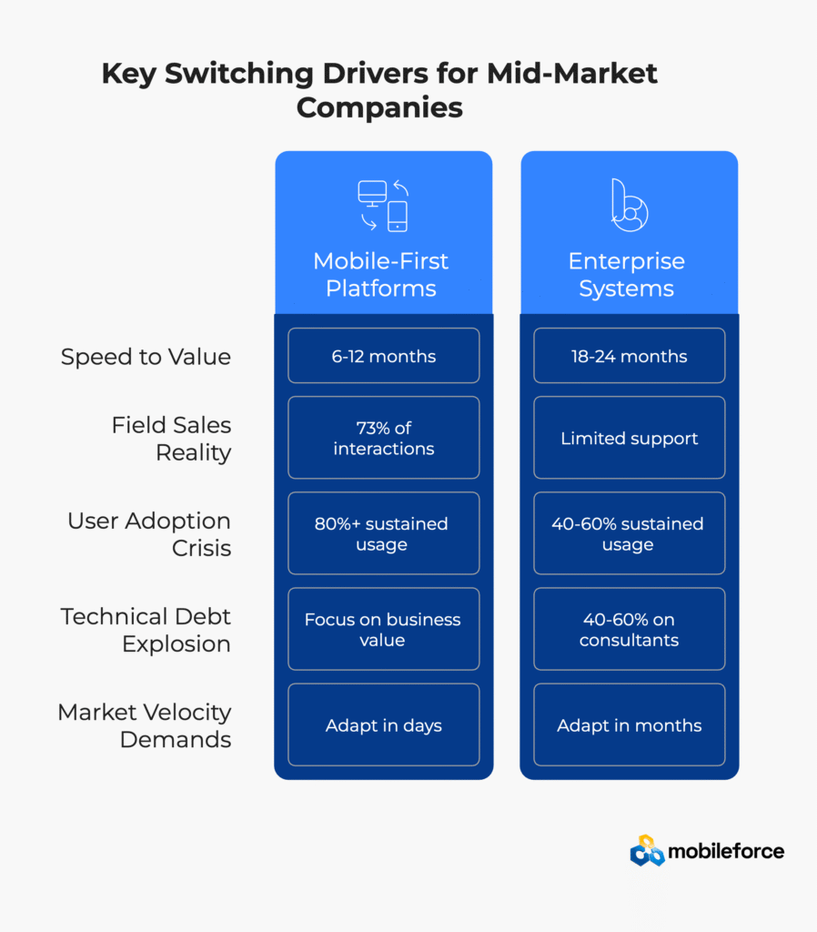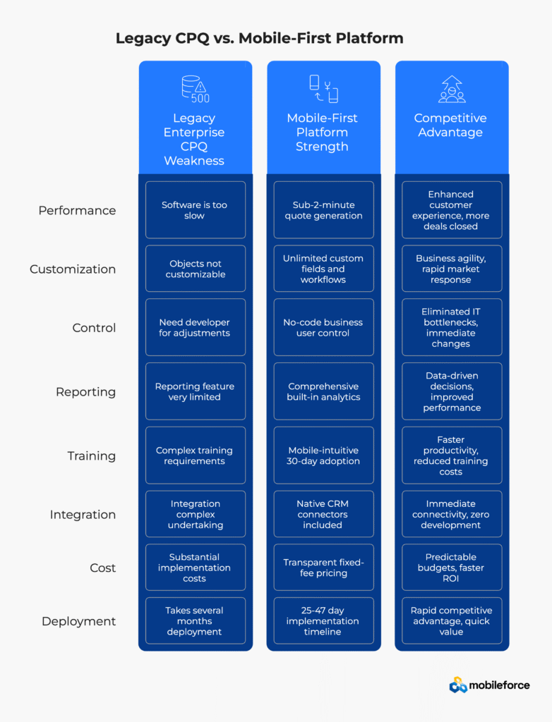 TL;DR: Mid-market companies are abandoning SAP CPQ for Mobileforce’s mobile-first CPQ platform because of three critical factors: 6x faster implementation (25-47 days vs 8-36 weeks), 80%+ user adoption rates, and 40-60% lower total cost of ownership. The fundamental issue isn’t features—it’s that enterprise platforms designed for Fortune 500 complexity create unnecessary friction for agile mid-market operations.