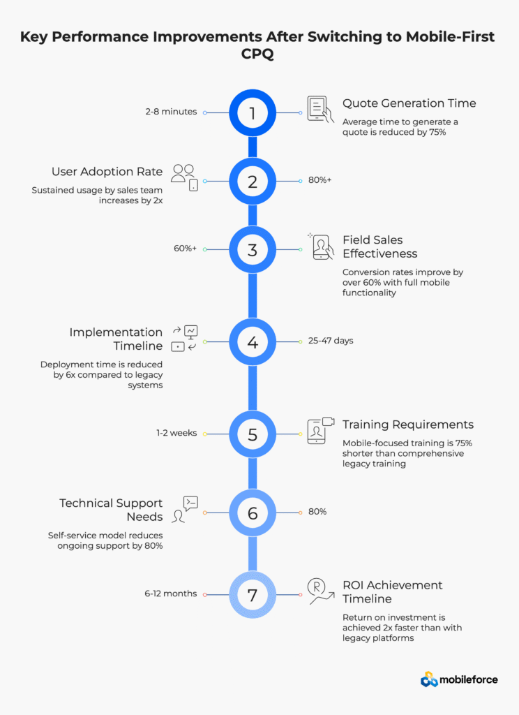 According to McKinsey research on B2B digital transformation, companies switching from legacy platforms to mobile-first alternatives typically see quote generation speed improvements of 75%, user adoption rates above 80%, and return on investment within 6-12 months rather than the 18-24 month timelines common with enterprise CPQ deployments.