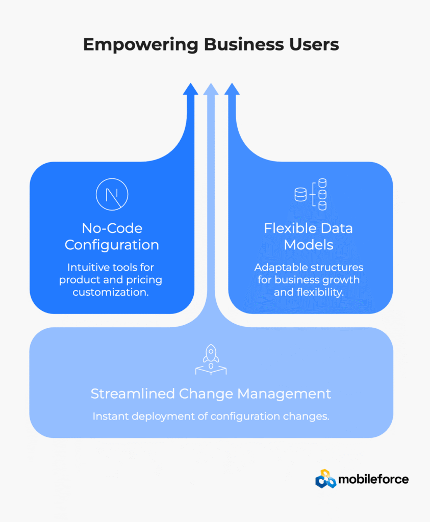 The Mobile-First Solution: No-code CPQ platforms enable business users to modify pricing rules, product configurations, and workflows without developer intervention. This eliminates IT bottlenecks and reduces ongoing operational costs.