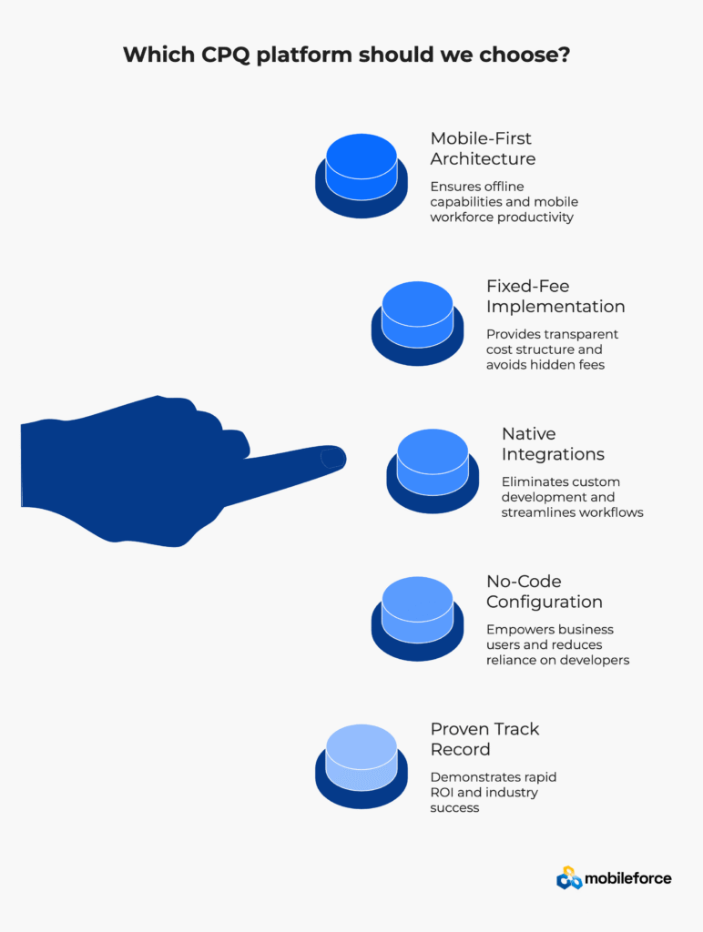 A: Mid-market companies evaluating CPQ platform comparisons typically find mobile-first solutions like Mobileforce most effective due to rapid 25-47 day implementations, 80%+ user adoption rates, and 40-60% lower total cost ownership. Unlike enterprise CPQ solutions requiring extensive technical resources, mobile-first platforms enable business users to control pricing without developer dependencies.