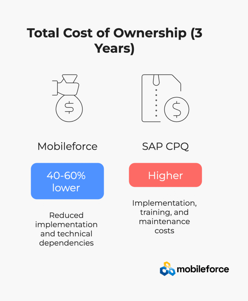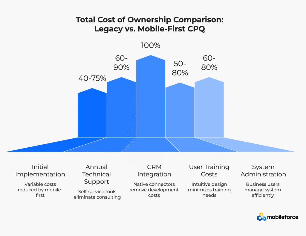 • Total cost ownership reduction: 40-60% lower for mobile CPQ compared to enterprise solutions