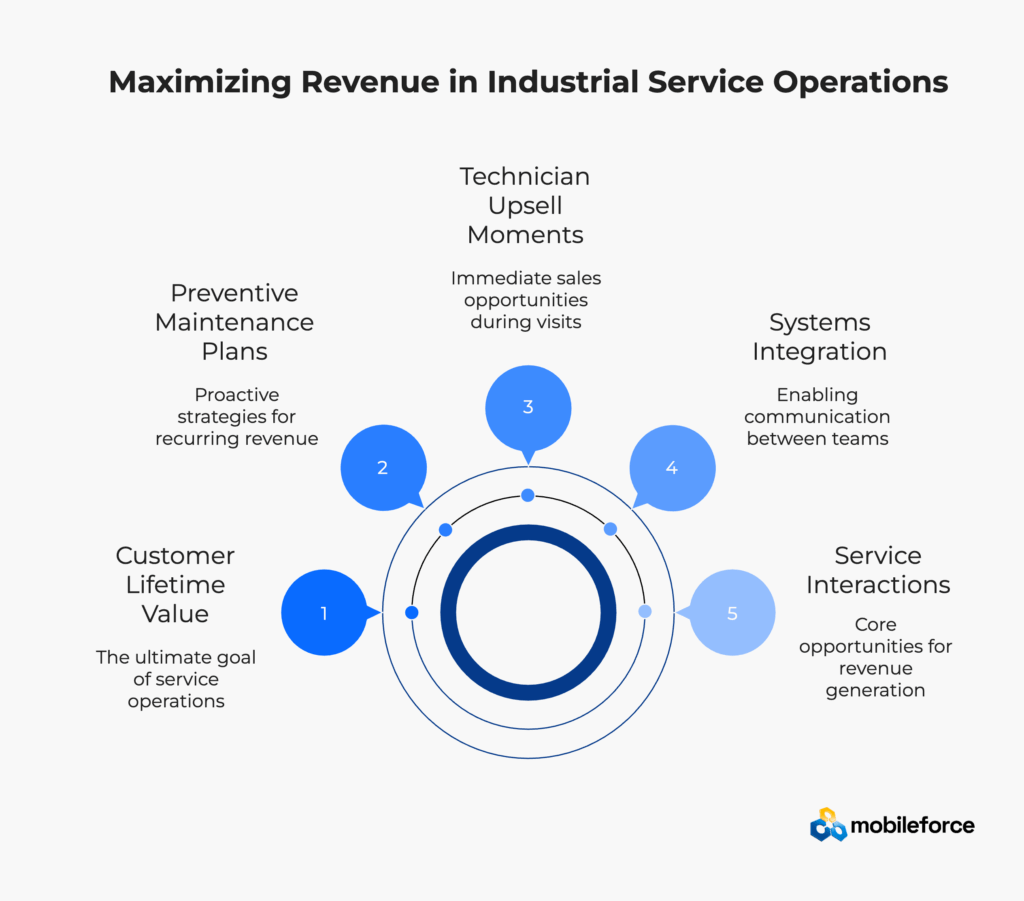 Industrial service revenue optimization strategies must address this gap by providing field technicians with mobile access to customer history, sales data, and upsell opportunities. When service teams understand the broader customer relationship and have clear pathways for communicating opportunities to sales teams, every field visit becomes a potential revenue-generating interaction.