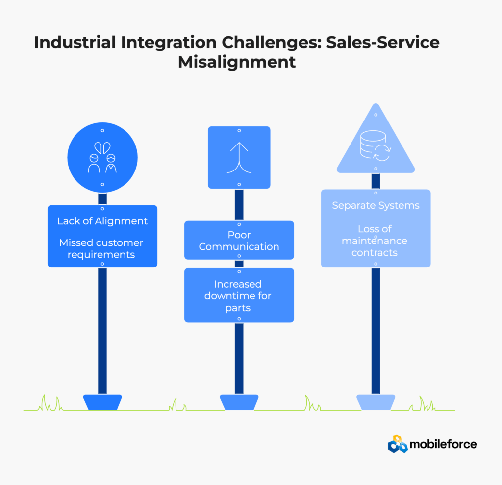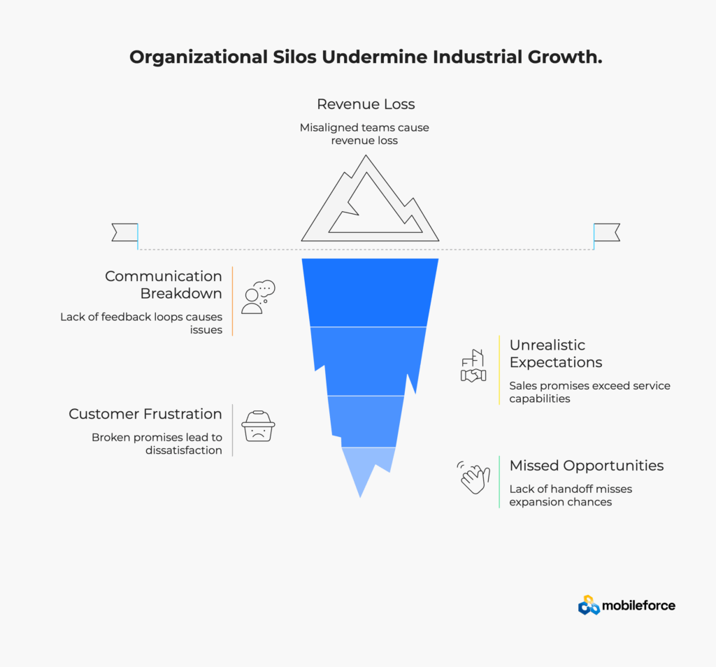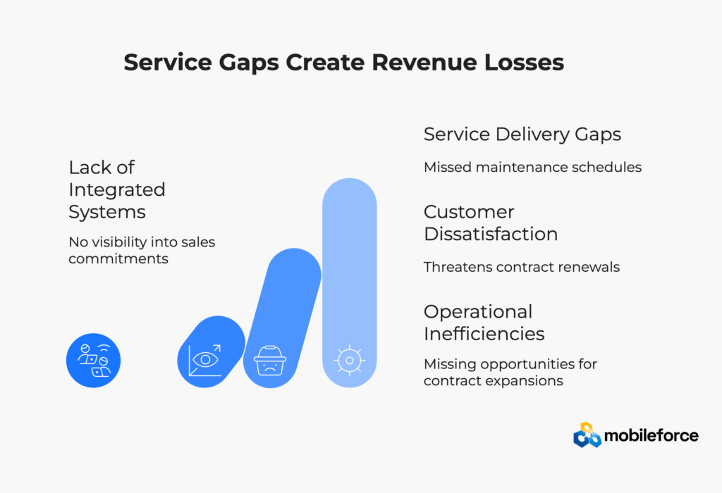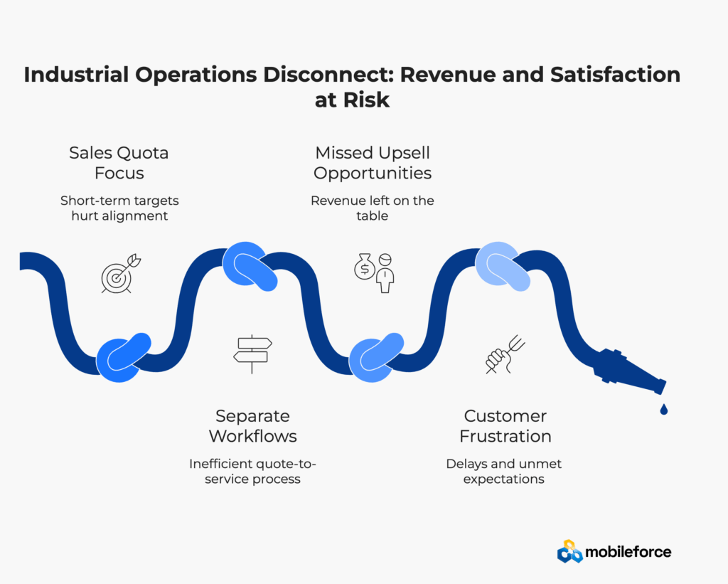 The consequences of this misalignment extend far beyond internal inefficiencies. When sales and service teams operate in isolation, companies experience installation delays that frustrate customers, miss critical opportunities for service contract upsells during field visits, and face higher customer churn rates due to unmet expectations and poor coordination between departments.
