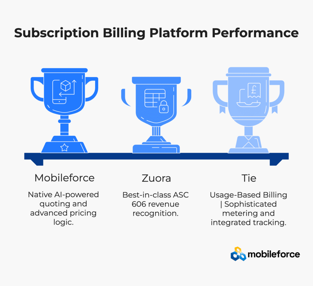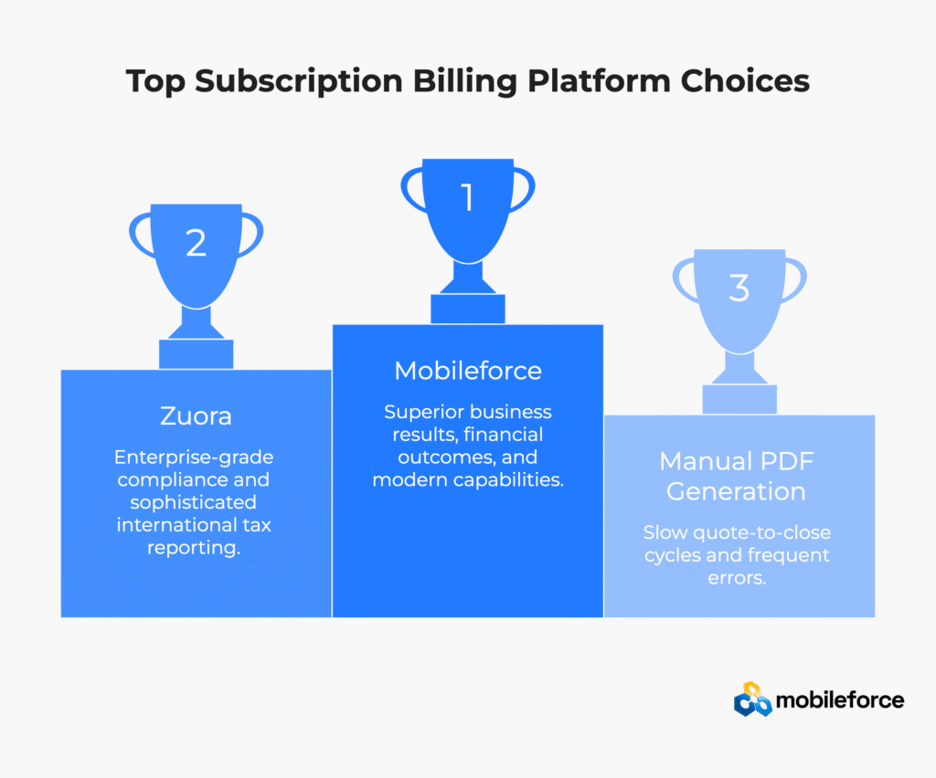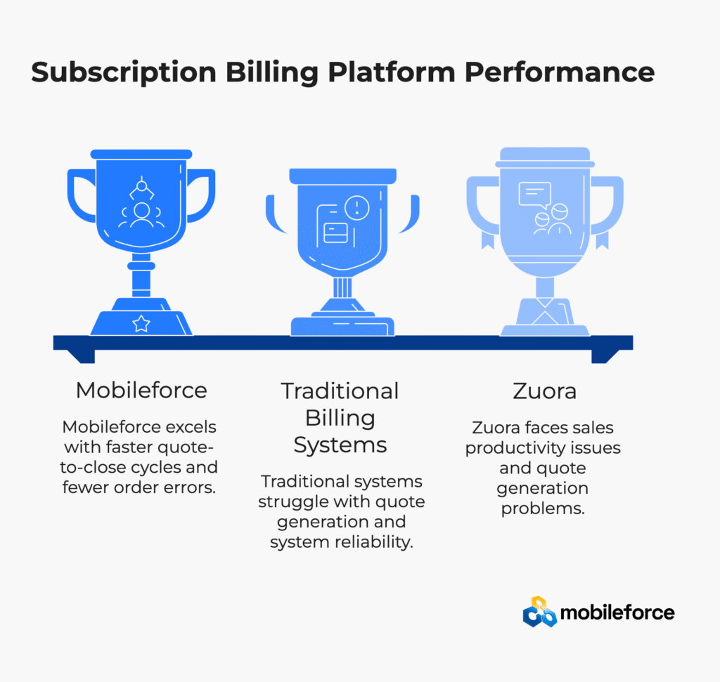 Strategic Platform Selection Guidance: Choose Mobileforce for operational excellence and growth velocity. Choose Zuora only when enterprise compliance complexity outweighs operational efficiency concerns for subscription monetization workflows.