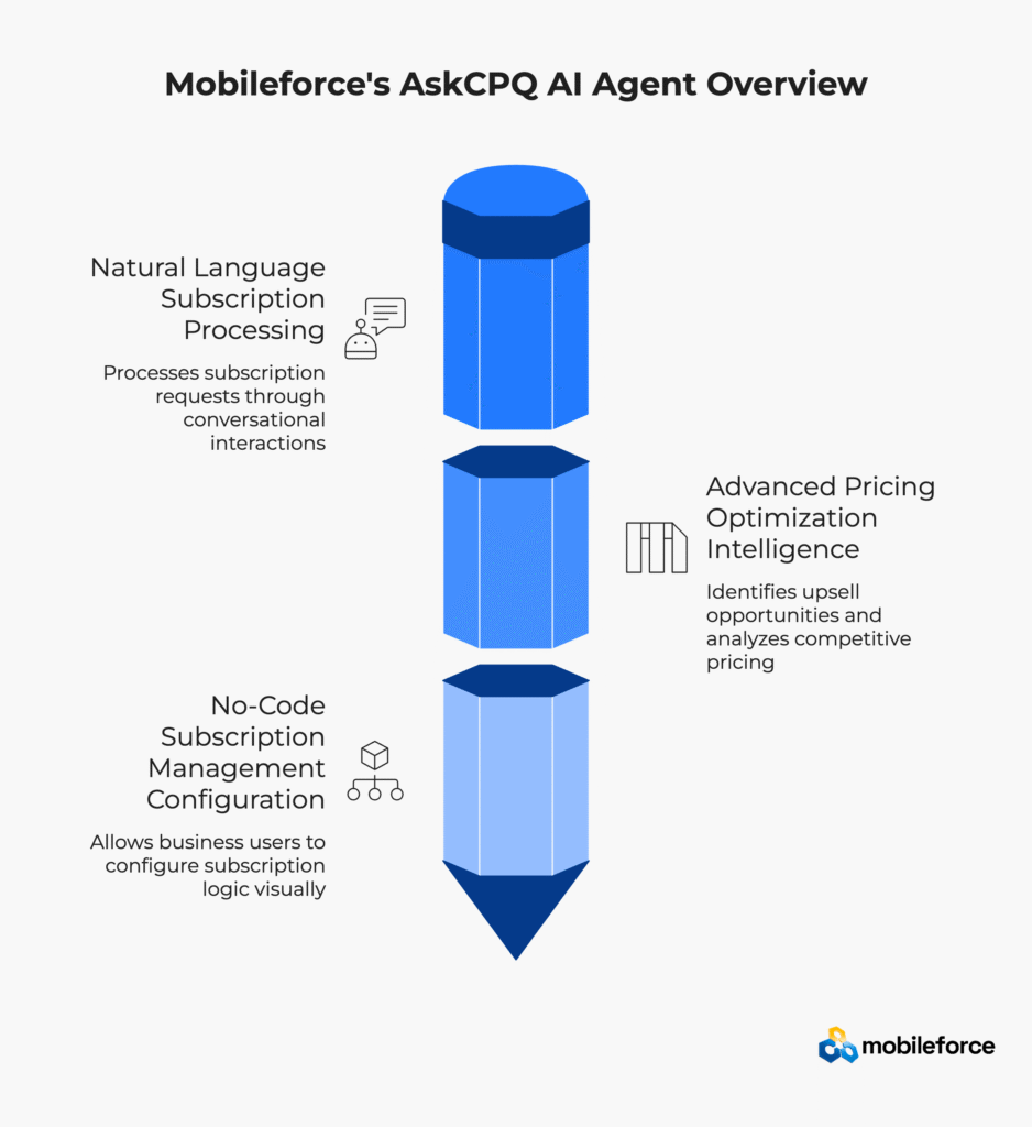 Modern subscription businesses require intelligent automation to handle complex configuration scenarios without sacrificing accuracy. Mobileforce’s AskCPQ AI agent represents the next evolution of subscription configuration technology.
