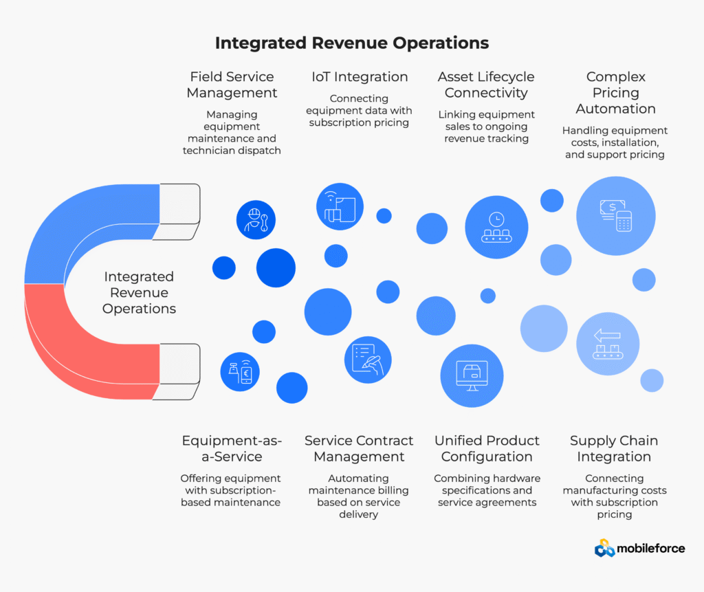 Manufacturing companies with hybrid business models combining equipment sales, maintenance services, and subscription revenue benefit from integrated revenue operations platforms rather than pure billing systems. These platforms support equipment-as-a-Service models, field service integration for maintenance scheduling, IoT connectivity for usage-based billing, and complex product configuration spanning hardware and services, making them ideal for manufacturers transitioning to subscription business models.
