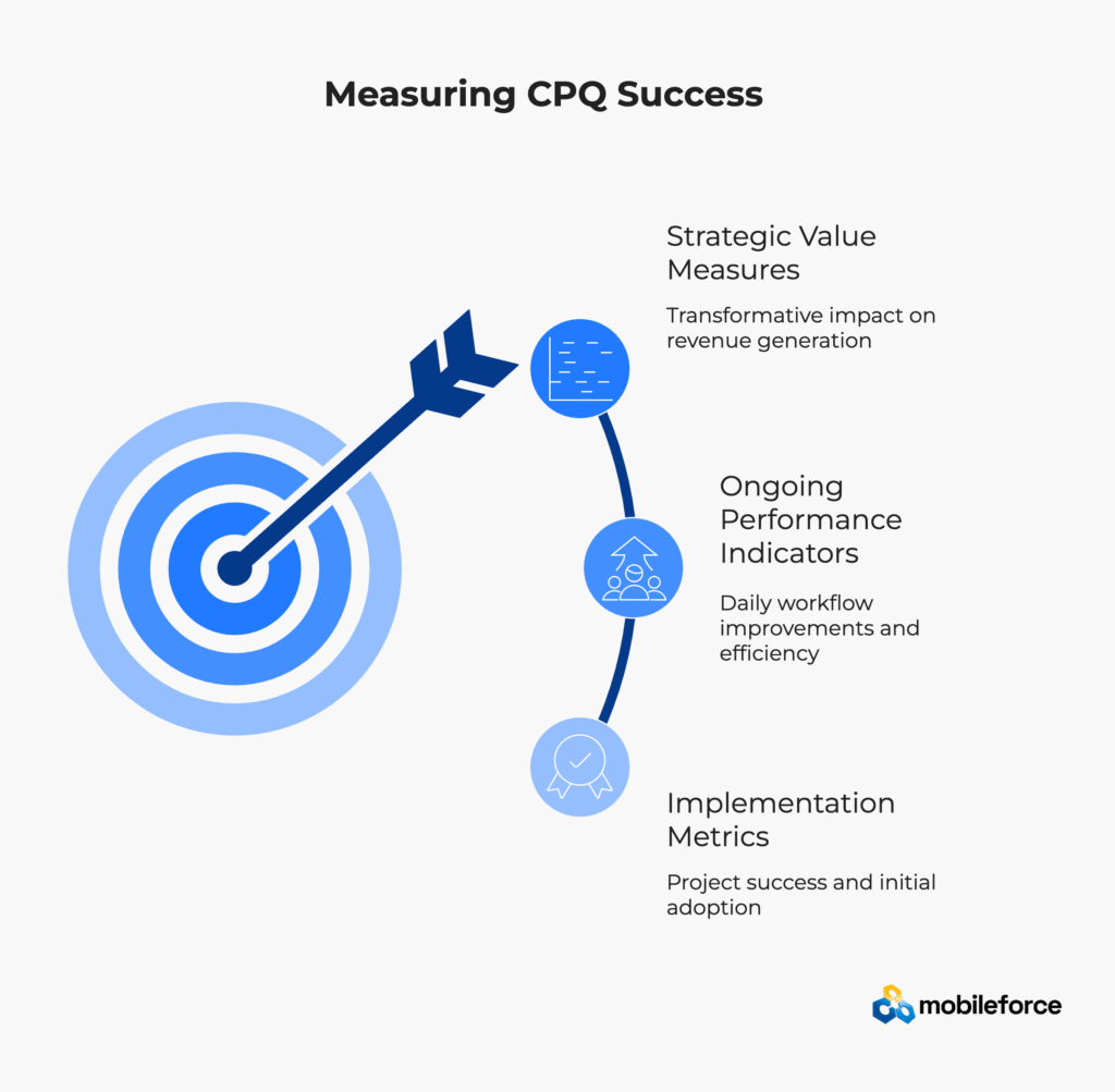 Smart companies track CPQ performance across three distinct dimensions. Implementation metrics tell you if the project succeeded. Operational indicators reveal whether the system is improving daily workflows. Strategic measures show if your CPQ investment is genuinely transforming how you generate revenue.