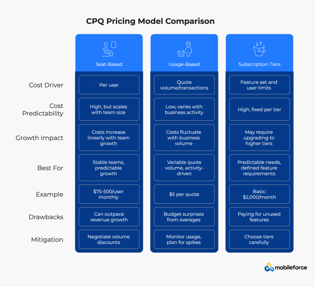 Usage-based pricing charges for quote volume, transaction count, or revenue processed. This creates natural alignment between CPQ costs and business activity, but introduces unpredictability in your total cost of ownership calculations.