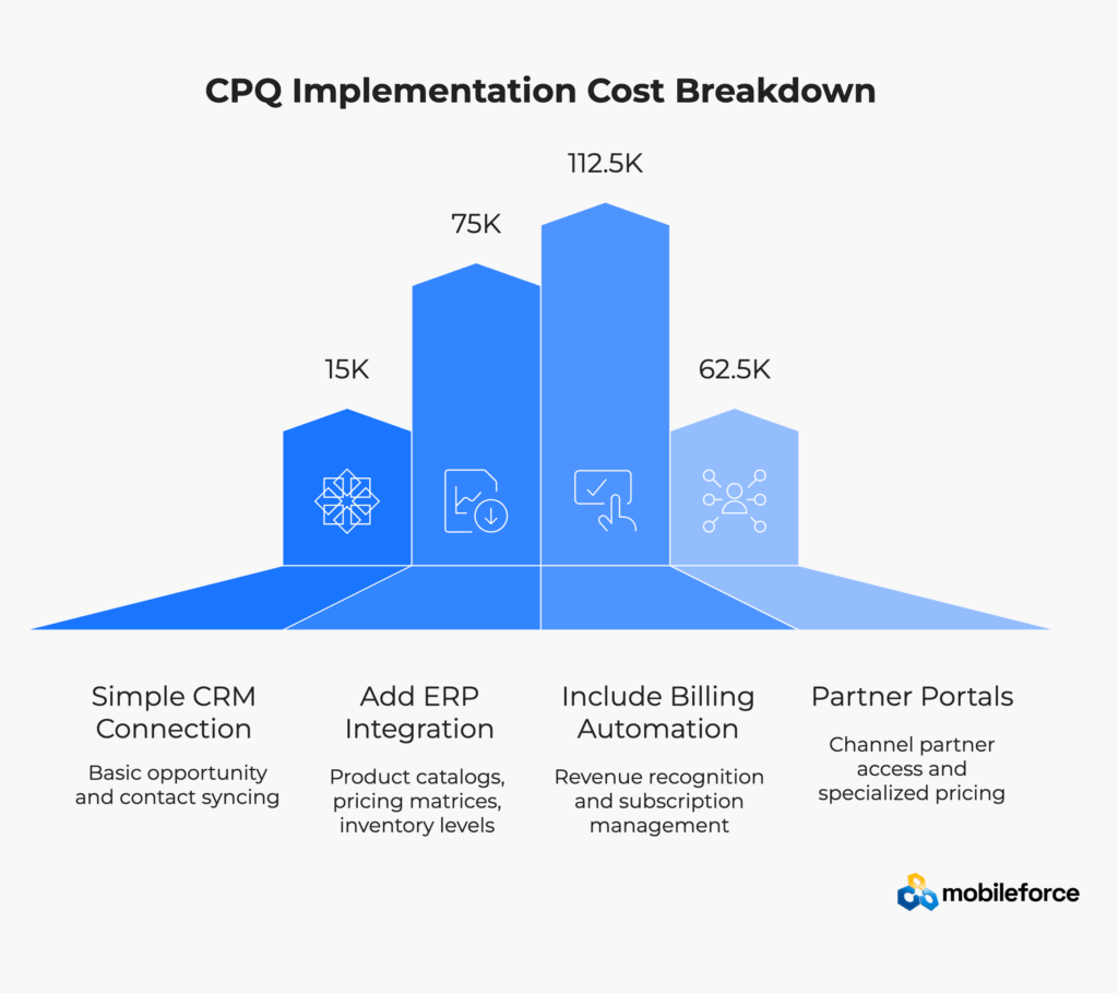 A telecommunications company might budget \$75,000 for CPQ integration based on CRM connection estimates. Final total cost of ownership could reach $280,000 as ERP complexity, billing requirements, and partner portal needs emerge.