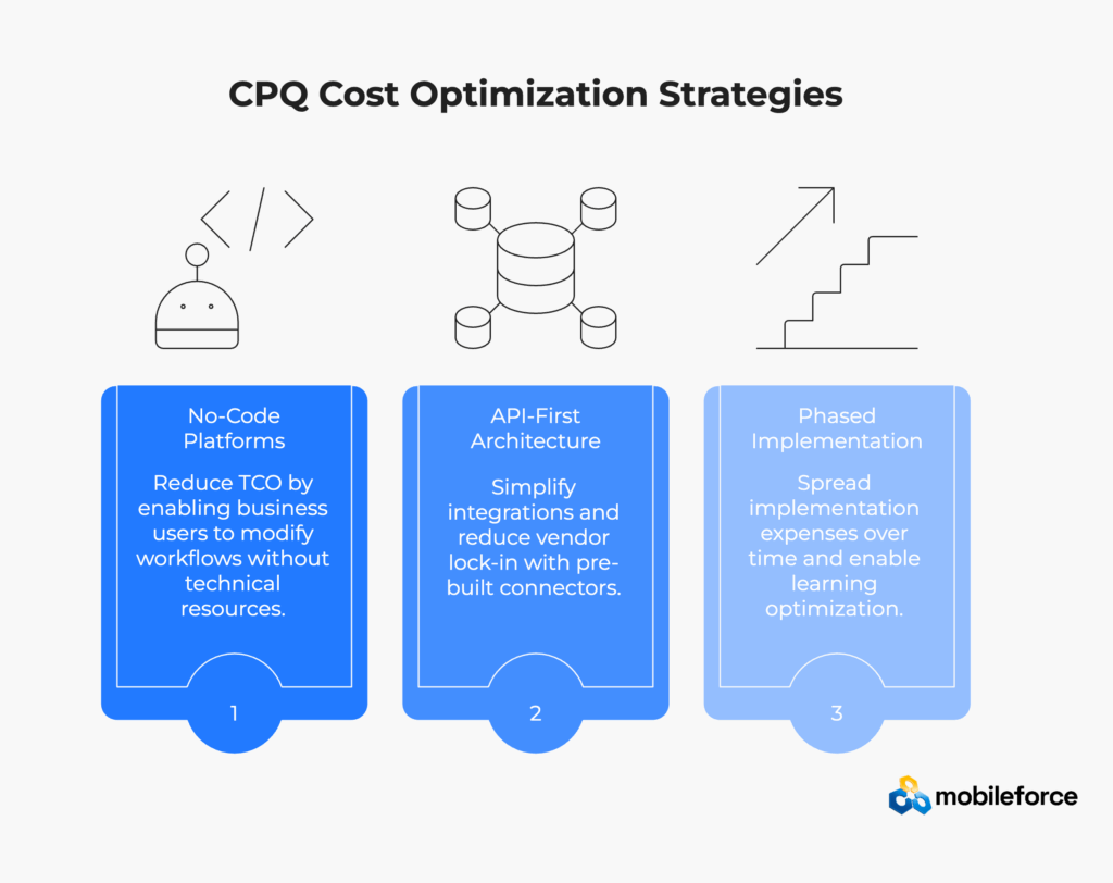 API-first CPQ platforms future-proof investments by simplifying integrations and reducing vendor lock-in. Pre-built connectors can reduce integration costs by 40-70% while improving reliability – a significant factor in total cost of ownership optimization.