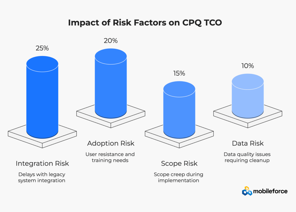 For a $500,000 base total cost of ownership, risk adjustments might add $75,000-125,000 to create realistic CPQ software costs projections.