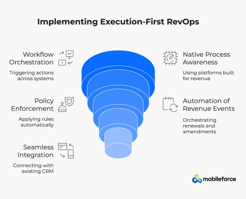 Stage 4: Execute Revenue workflows are triggered across quote-to-cash systems including CPQ platforms, contract lifecycle management, billing automation, service delivery coordination, and customer success interventions. This stage requires cross-system orchestration and workflow automation capabilities that most CRM platforms don’t provide natively.