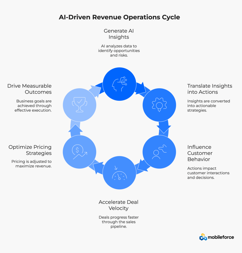 When Mobileforce’s Revenue Operations Cloud receives AI insights from CRM systems or predictive analytics engines, it triggers immediate, systematic responses that coordinate actions across multiple systems without human intervention.
