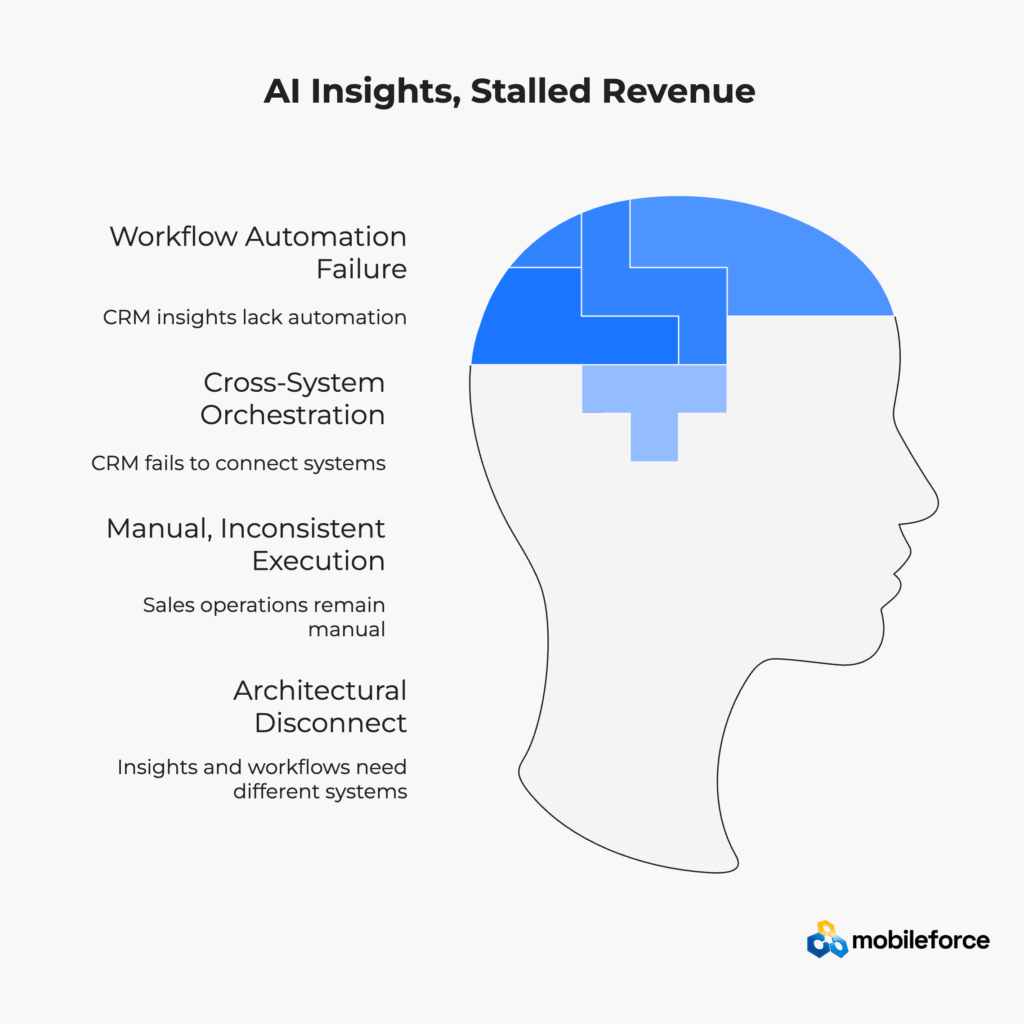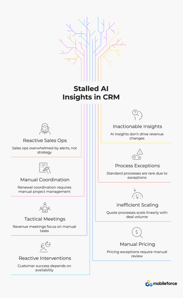 The core problem isn’t the quality of AI insights—it’s that CRMs are designed as systems of record, not systems of action. While CRMs excel at capturing data and surfacing predictions, they lack the infrastructure to orchestrate revenue workflows across CPQ systems, contracts, billing, and field service operations. RevOps execution platforms bridge this gap by translating AI insights into automated quote generation, policy enforcement, and cross-system orchestration that actually drives revenue outcomes.