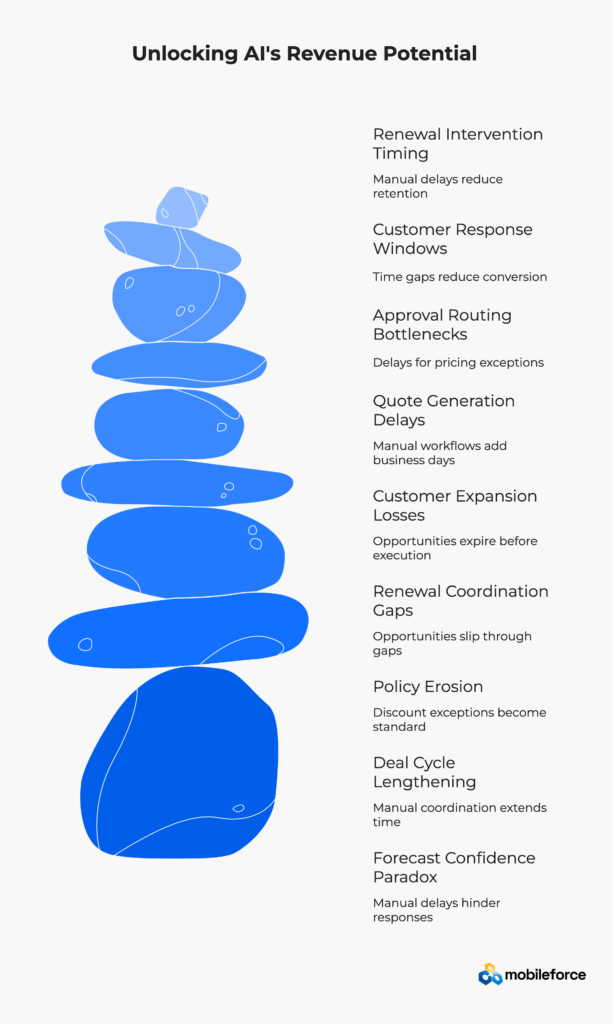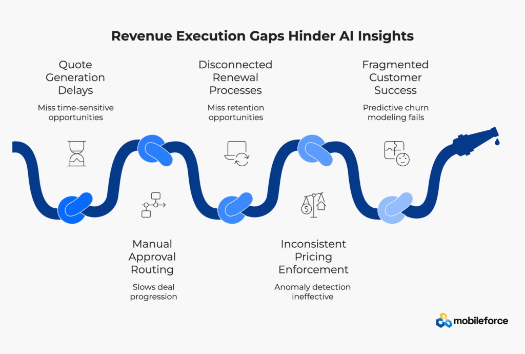Yet here’s the disconnect: while CRMs surface increasingly sophisticated predictions about deal risk, churn probability, and pricing anomalies, actual revenue execution remains frustratingly manual and inconsistent. Sales operations teams still spend hours creating quotes, routing approvals, and coordinating renewals—despite having AI that supposedly identifies exactly what needs attention.