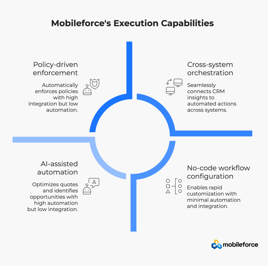 Cross-system orchestration: Mobileforce connects CRM insights to automated actions across CPQ, contract lifecycle management, billing systems, and service operations. When your CRM AI identifies opportunities or risks, Mobileforce can automatically trigger appropriate workflows without manual intervention.