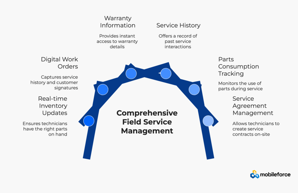 Mobileforce connects traditionally separate processes in a unified field service management platform. A repair estimate generated by a technician automatically becomes a work order, triggers parts ordering, and creates accurate invoicing – all within the same FSM system. This eliminates data re-entry, reduces errors, and provides complete customer relationship visibility across sales and service teams in the field service workflow.