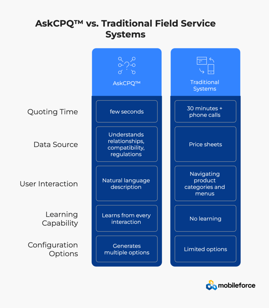 AskCPQ™ is Mobileforce’s AI-powered quoting engine that uses natural language processing to generate field service quotes conversationally. Instead of navigating complex product catalogs in traditional FSM software, technicians can describe customer requirements in plain English and receive intelligent configurations that consider product relationships, compatibility requirements, and local regulations. The field service system learns from interactions to provide increasingly accurate recommendations.