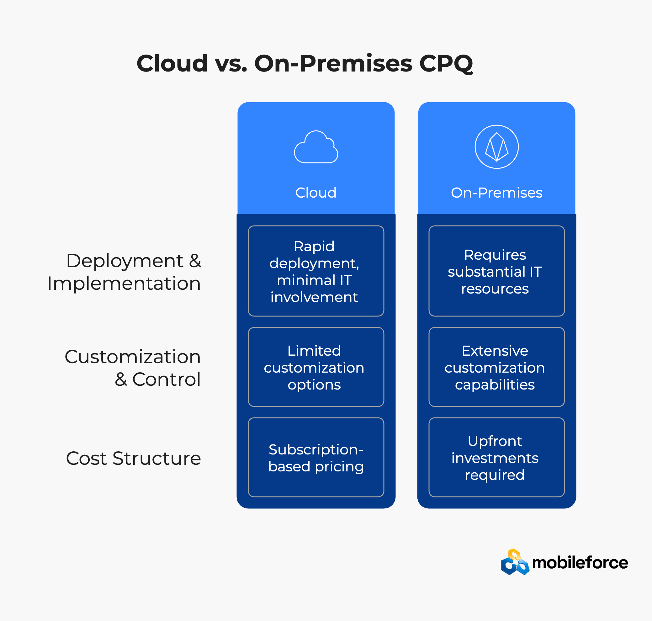 Cloud CPQ solutions offer rapid deployment capabilities with minimal IT involvement, enabling organizations to implement systems quickly without extensive infrastructure setup. Standard deployment times for cloud solutions range from weeks to months compared to the extended timelines required for on-premises implementations.