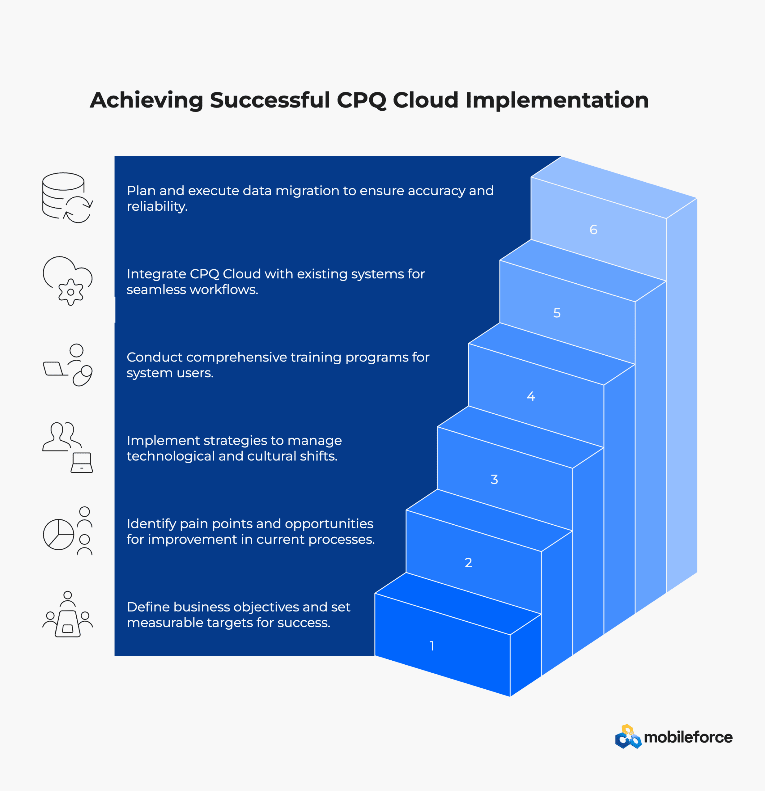Successful CPQ Cloud implementations begin with clear definition of business objectives, measurable targets, and specific outcomes. Organizations should establish baseline metrics for quote cycle times, accuracy rates, and deal sizes to measure implementation success.