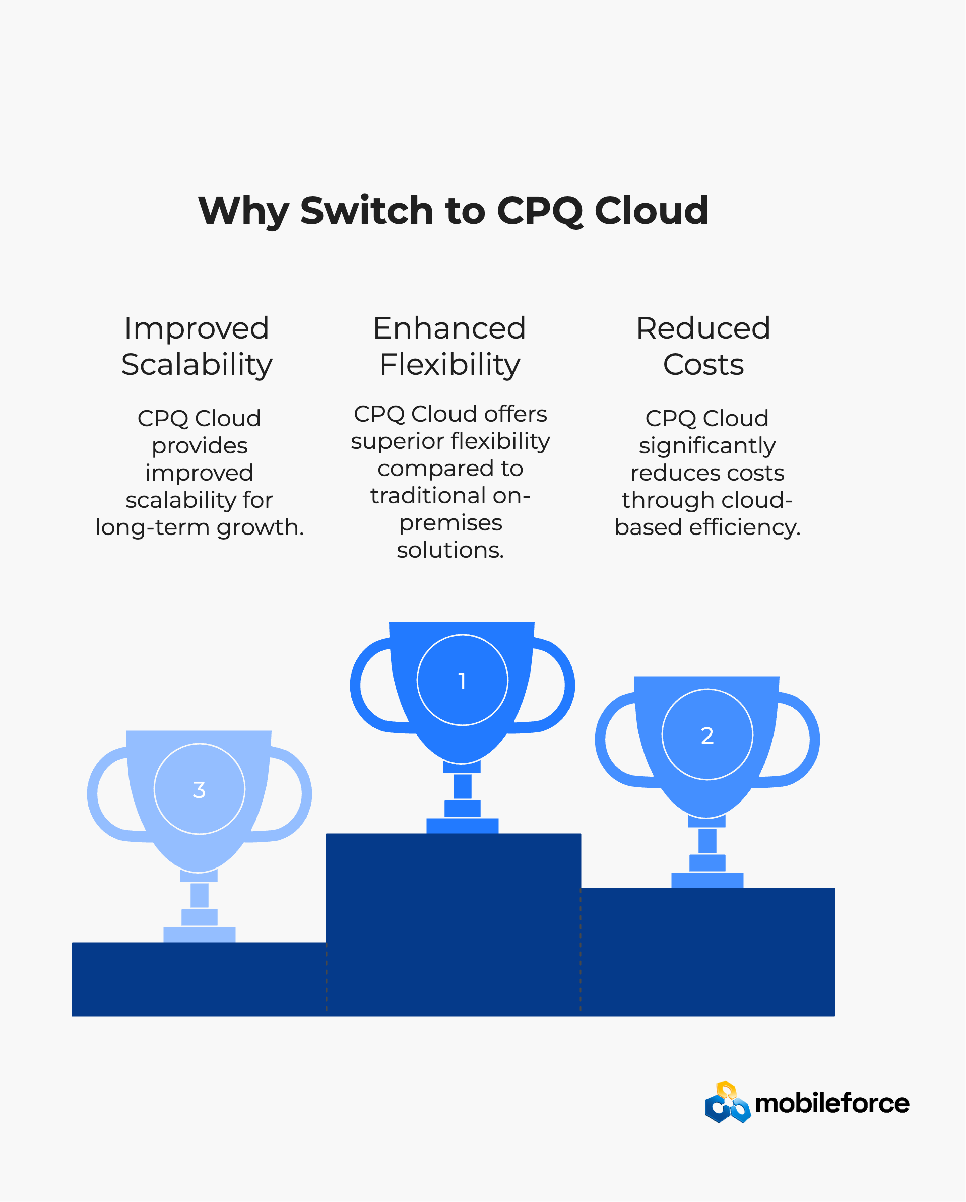 CPQ Cloud solutions eliminate significant infrastructure costs associated with on-premise deployments while providing predictable subscription-based pricing models. Organizations avoid substantial upfront hardware investments, ongoing maintenance expenses, and dedicated IT resources required for on-premise solutions.