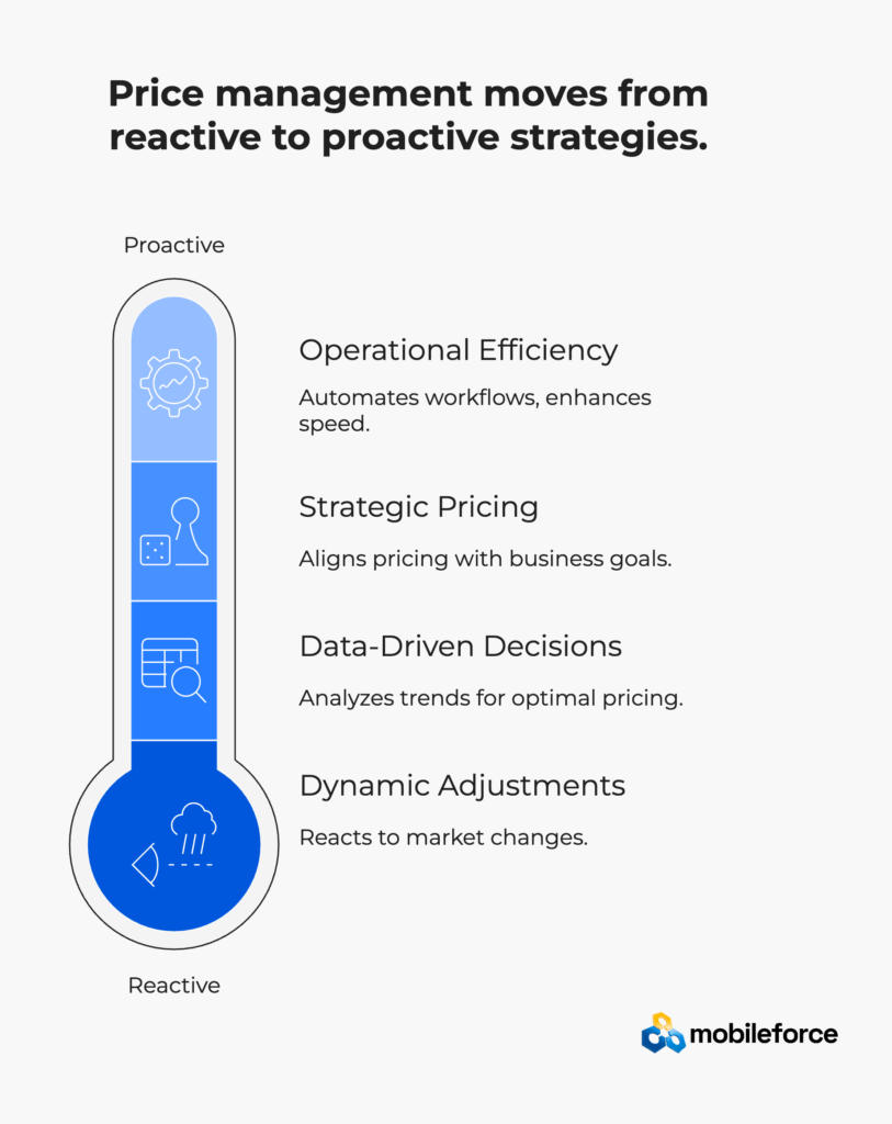 Operational Efficiency: By automating pricing workflows and integrating with other business systems like CRM or ERP, price management reduces errors and enhances decision-making speed.